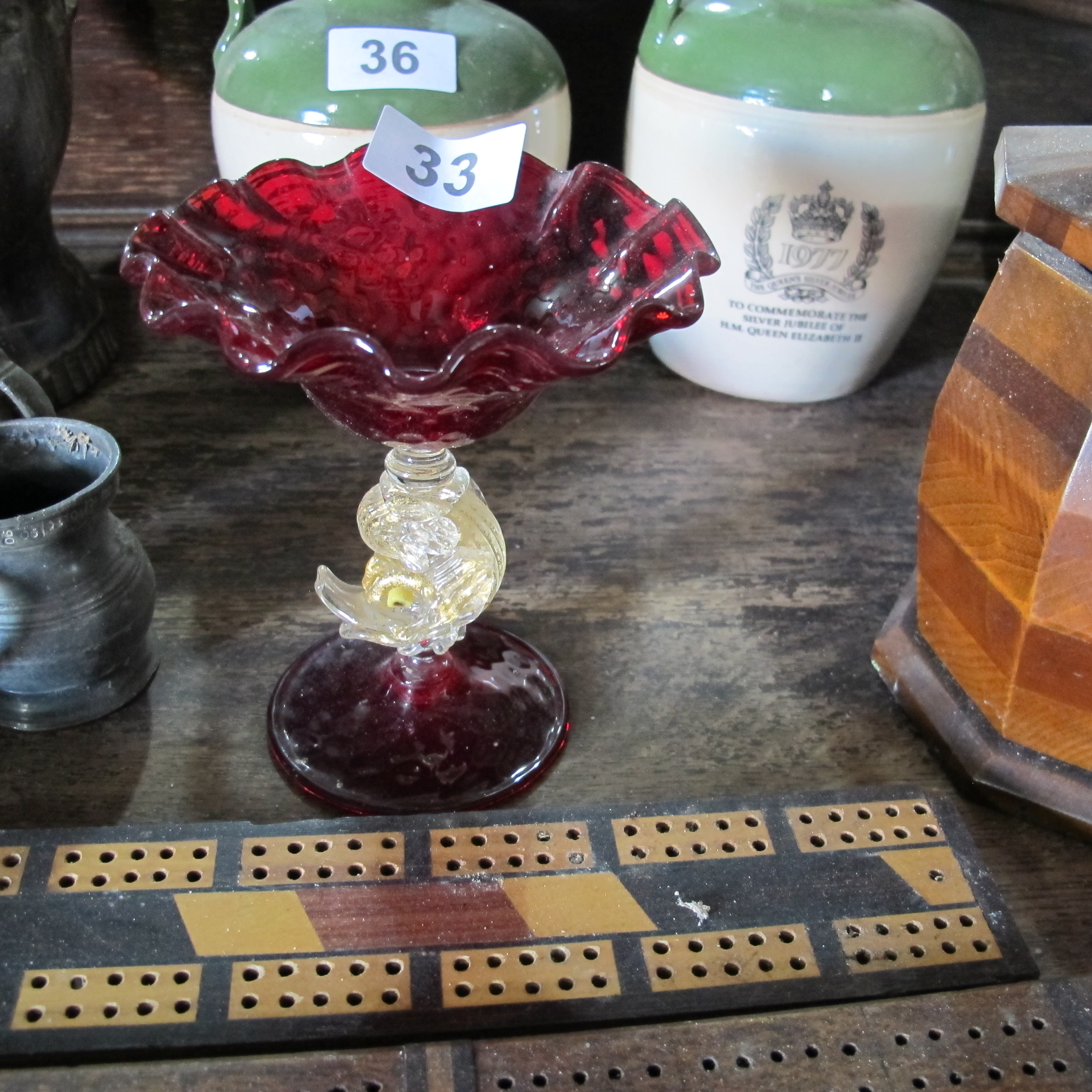 rare mid century Murano Salviati dolphin red candleholder with gold flake. 7 inches height