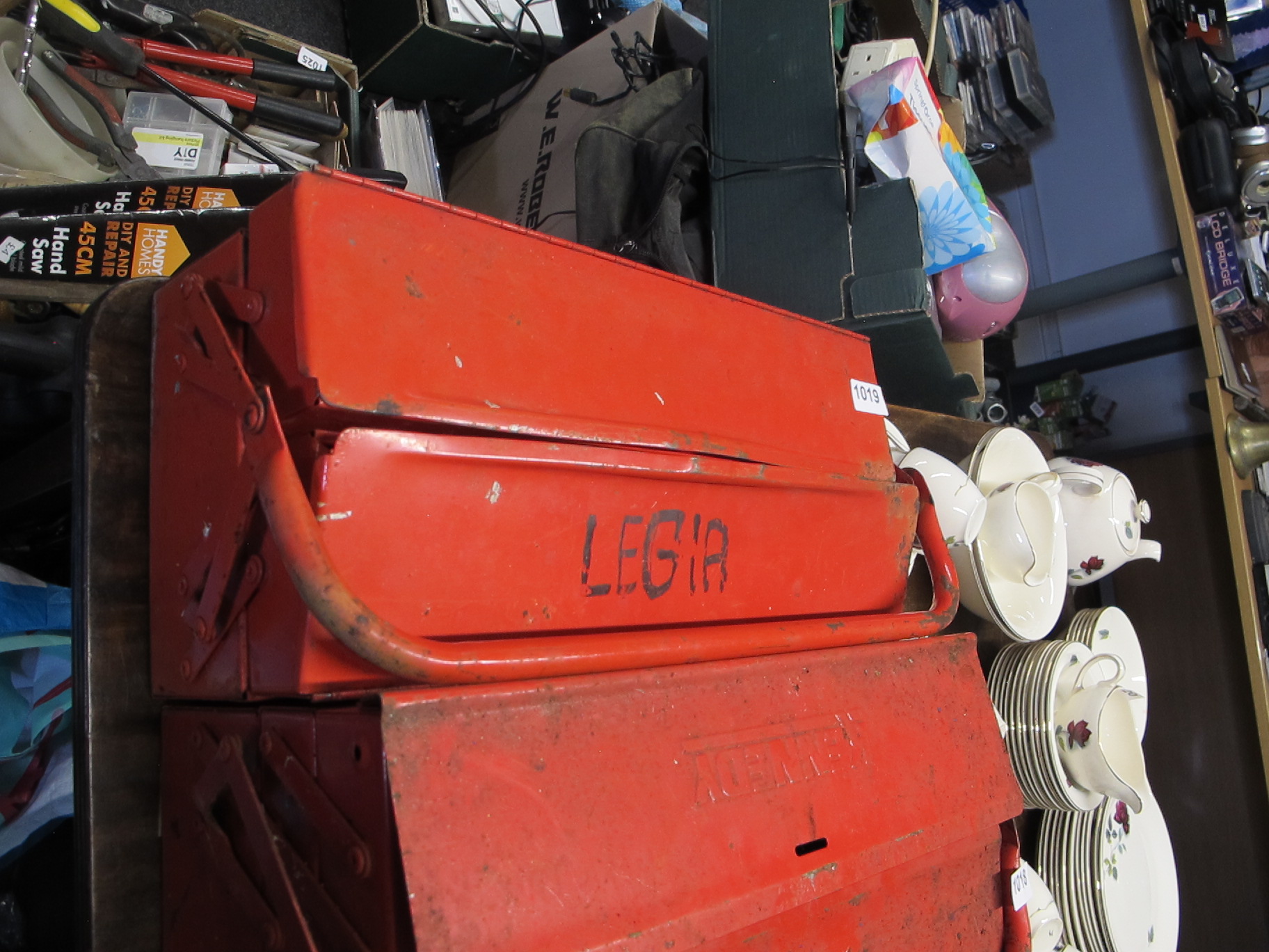 Red-Painted Metal Toolbox with tools inside