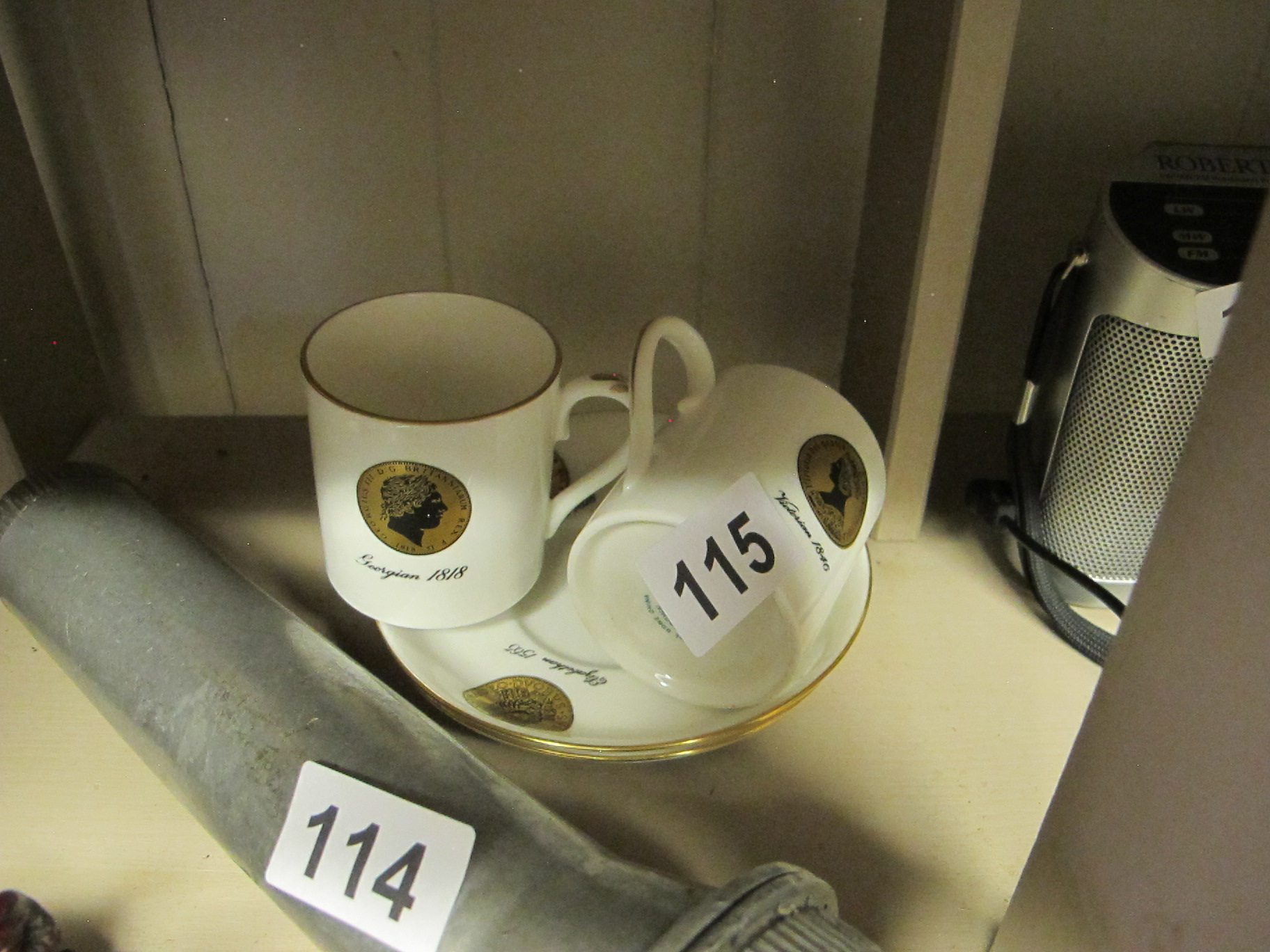 A Commemorative Ceramic Three-Piece Tea or Coffee Set, Depicting Georgian, Victorian, and Edwardian Monarchs