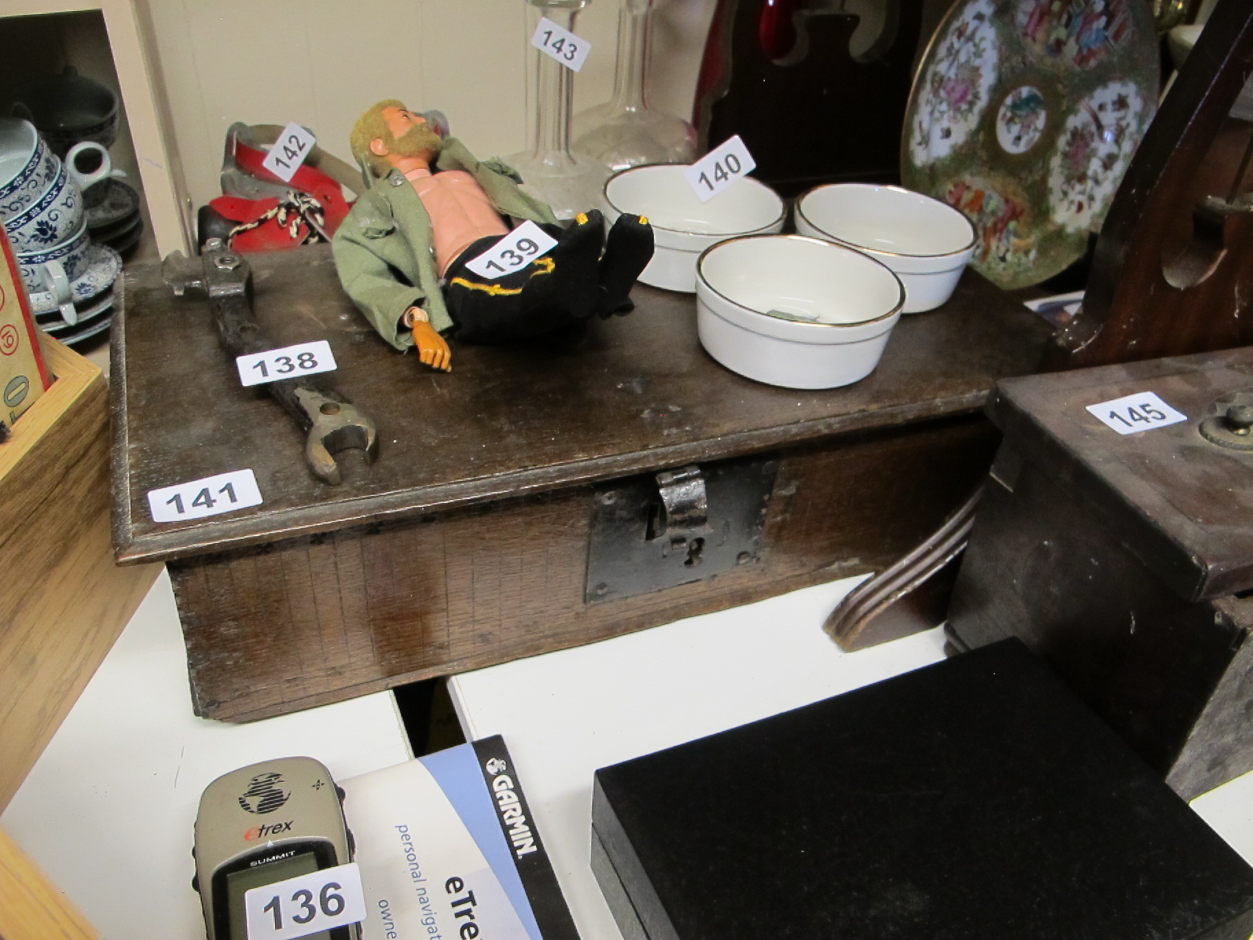 A dark, aged wooden chest featuring a prominent metal lock plate and hasp.