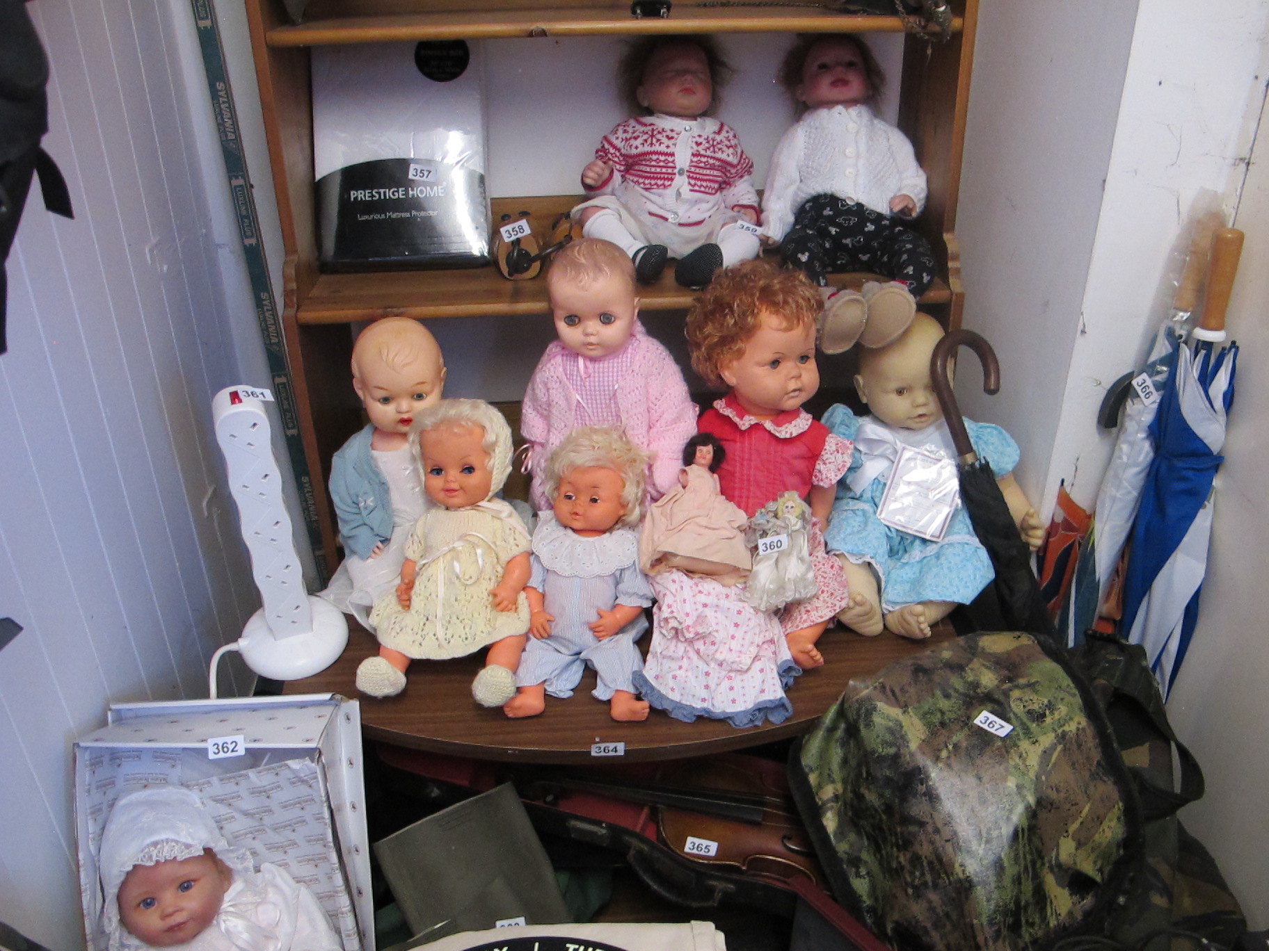 A Group of Baby and Child-Like Dolls with Miscellaneous Household Items