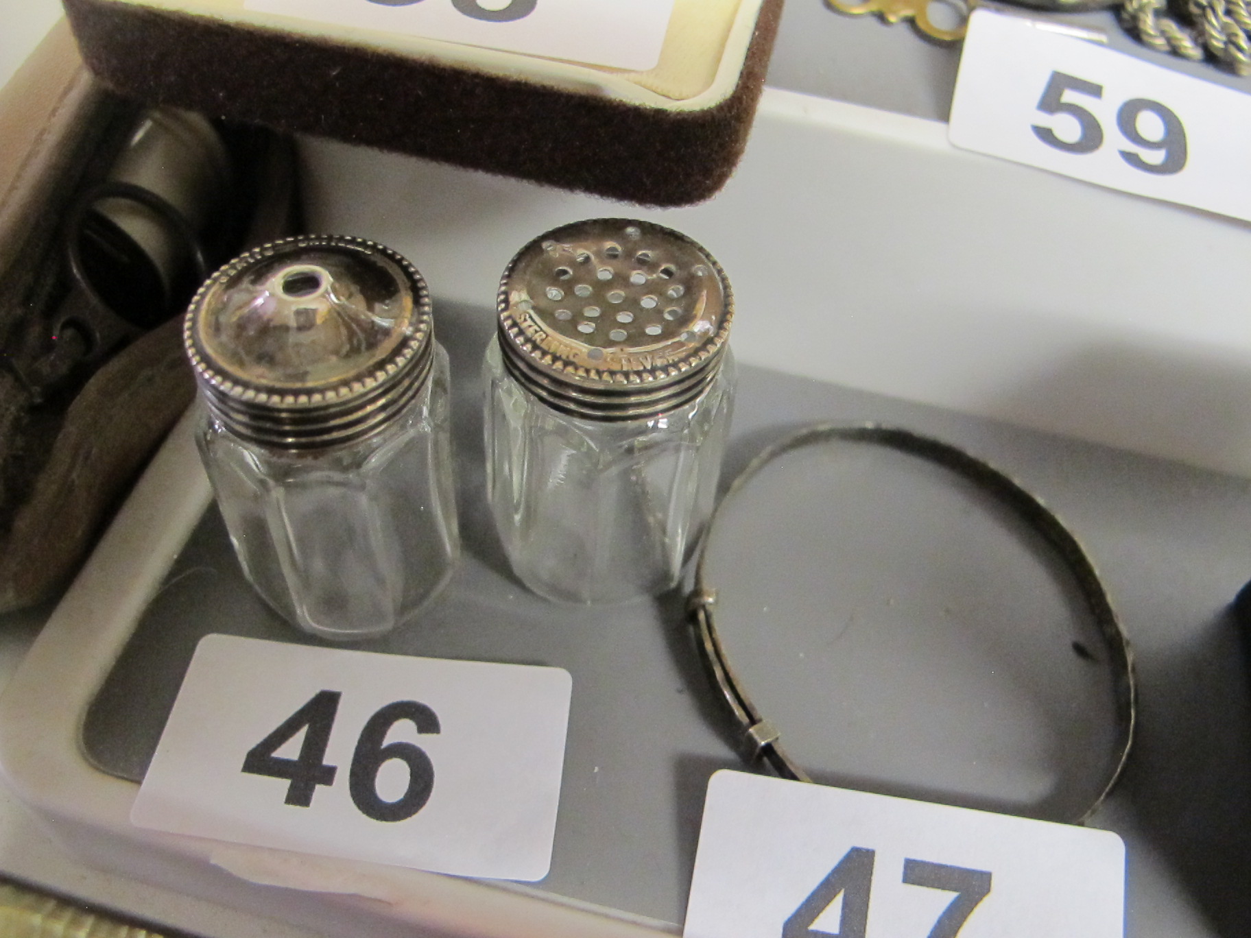 A Pair of Glass Condiment Shakers, One with Sterling Silver Cap, and a Metal Bangle