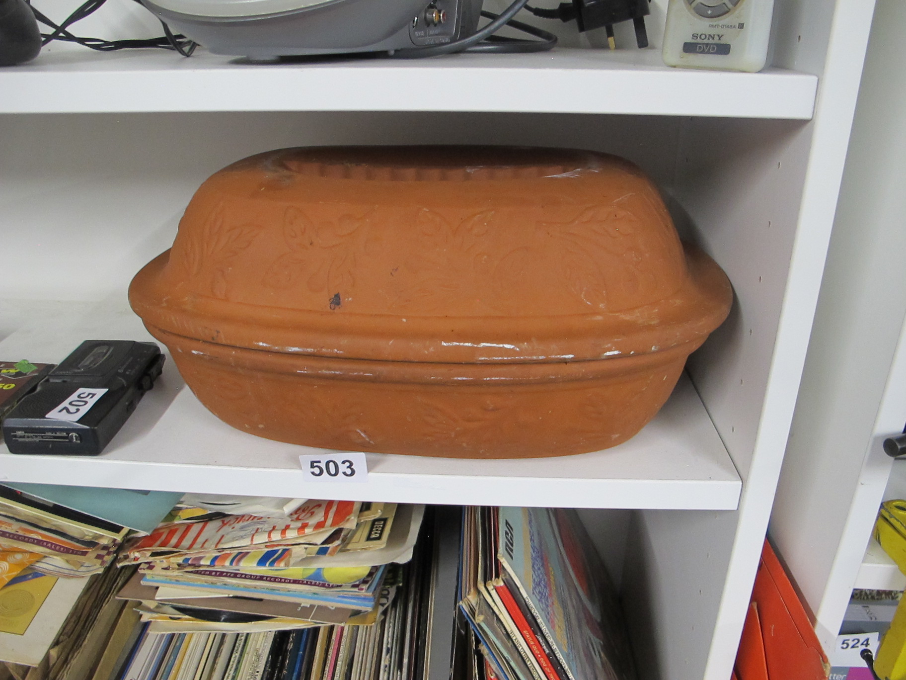 An Unglazed Terracotta Lidded Cooking Pot or Baker with Molded Decoration