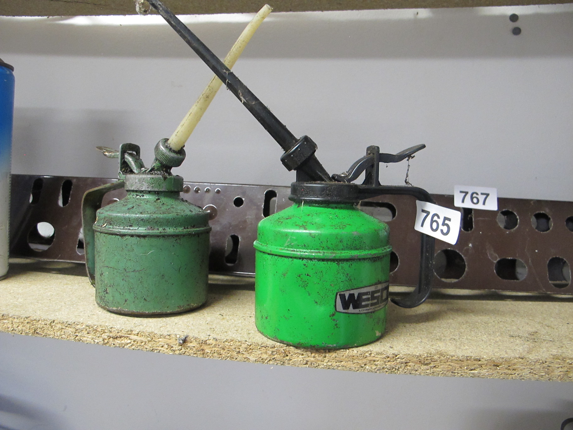 A Pair of Vintage Painted Metal Workshop Oil Cans