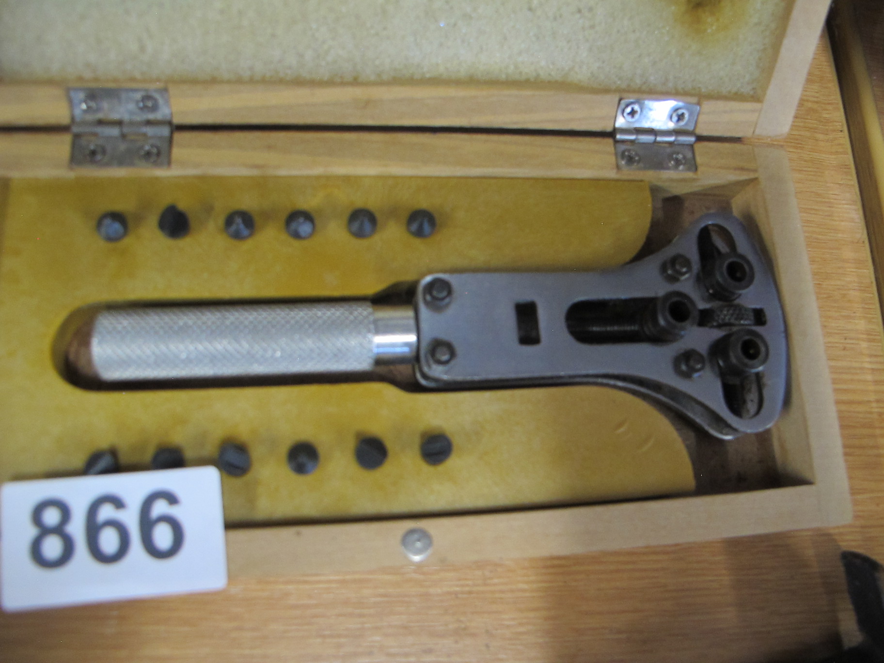 A Mid-to-Late 20th Century Watch Case Opener Tool in Fitted Wooden Box