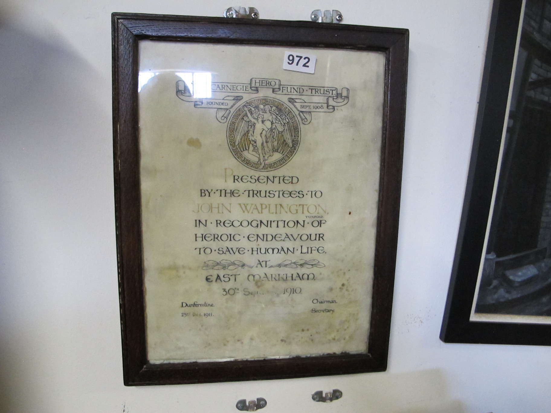 Ephemera item: Carnegie Hero Fund Trust Certificate to John Waplington, 1911