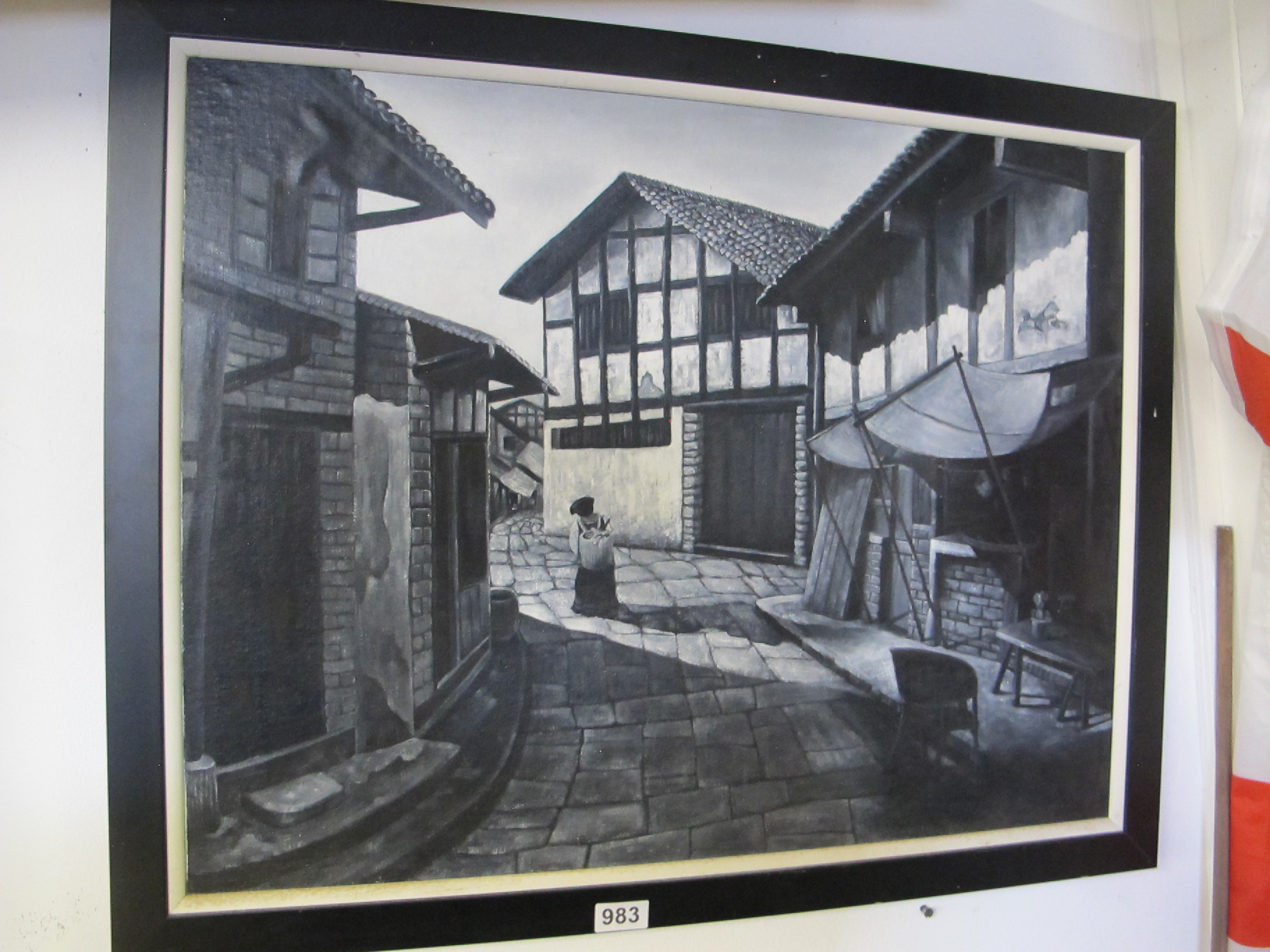 A Framed Monochromatic Painting of an Older Architectural Street Scene