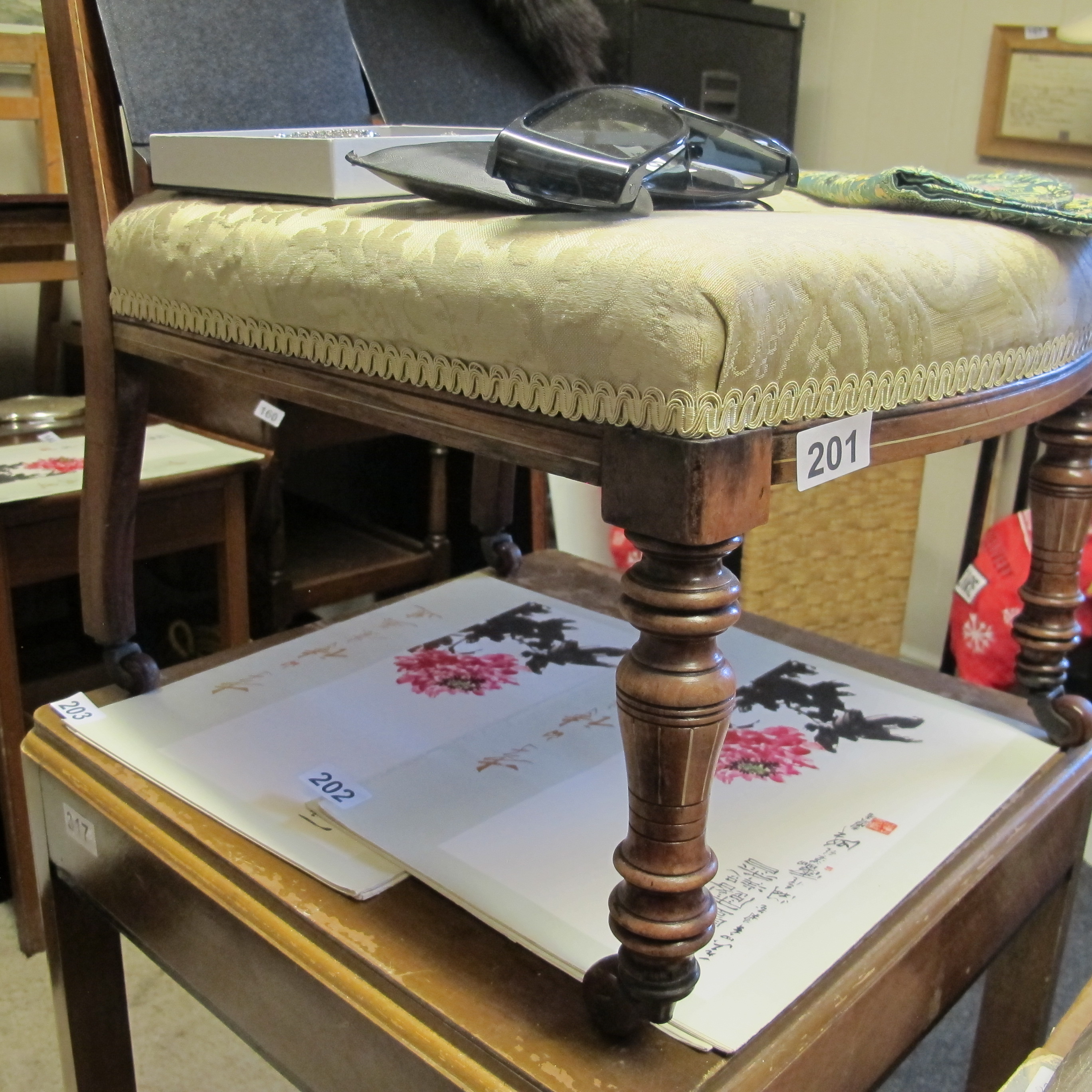 Victorian or Edwardian Style Dark-Stained Wooden Stool with Damask Upholstery