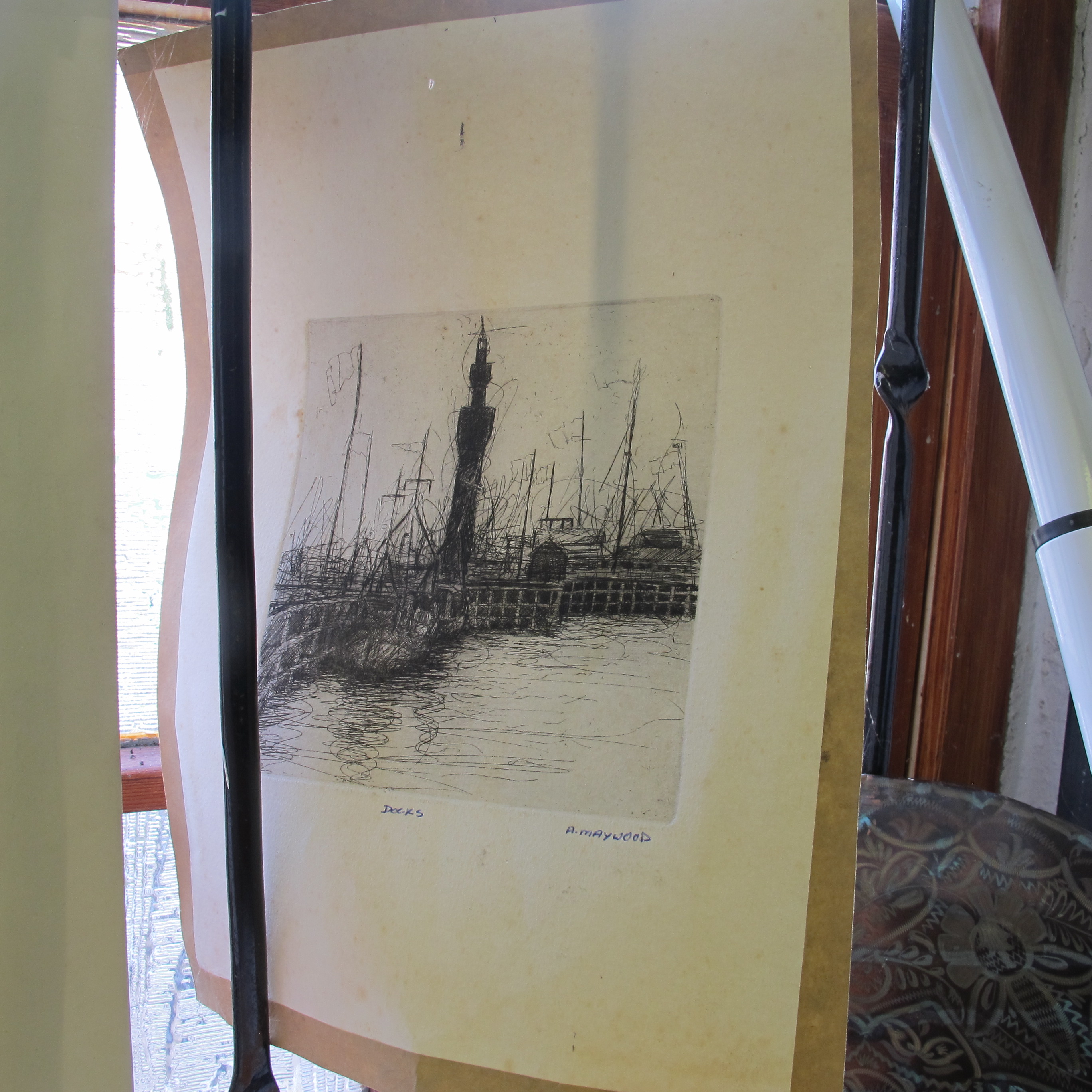 A. Maywood, ‘Docks’, Signed Etching of a Harbor Scene