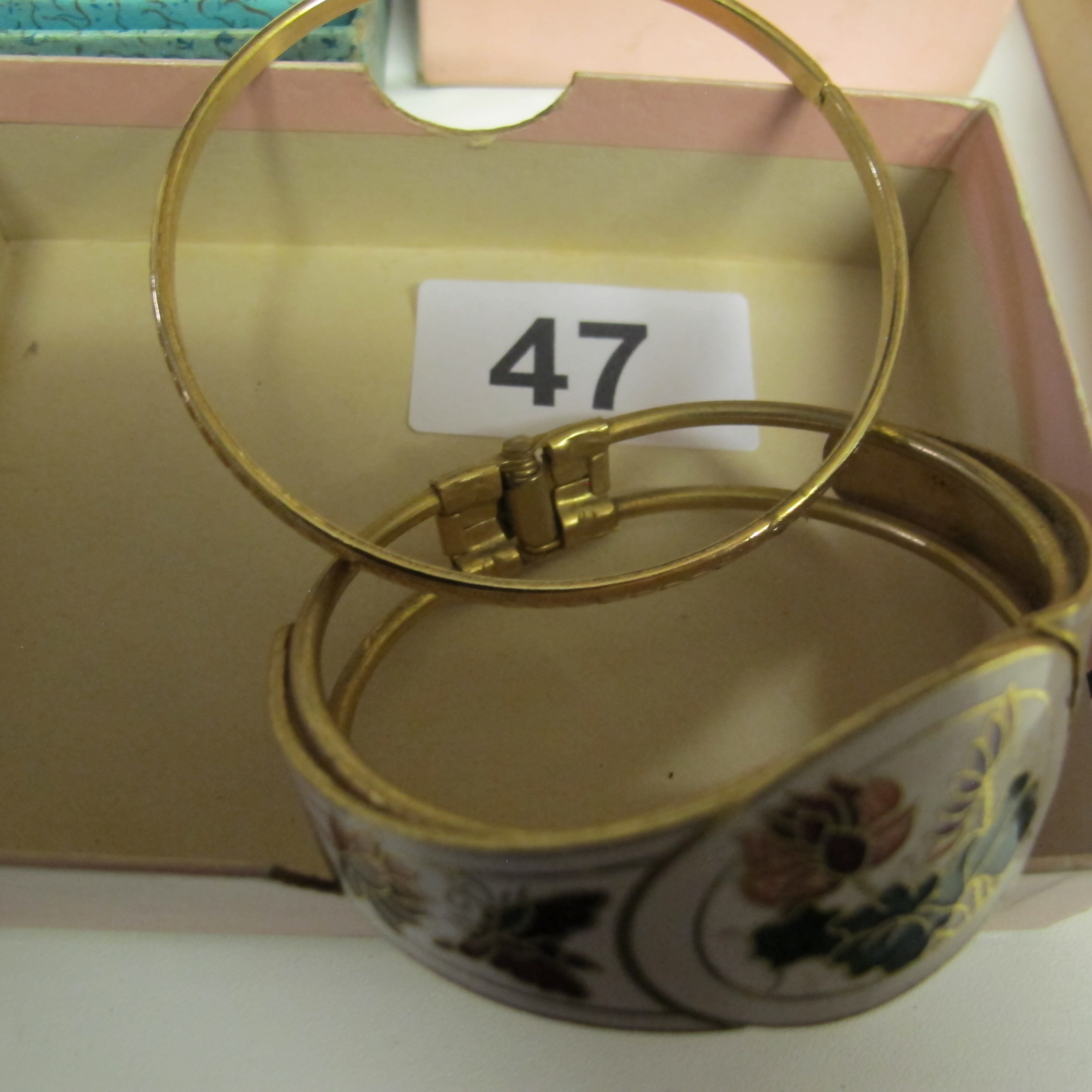 Vintage Cloisonne Enamel Floral and Butterfly Hinged Bangle Bracelet with Companion Gold-Toned Bangle