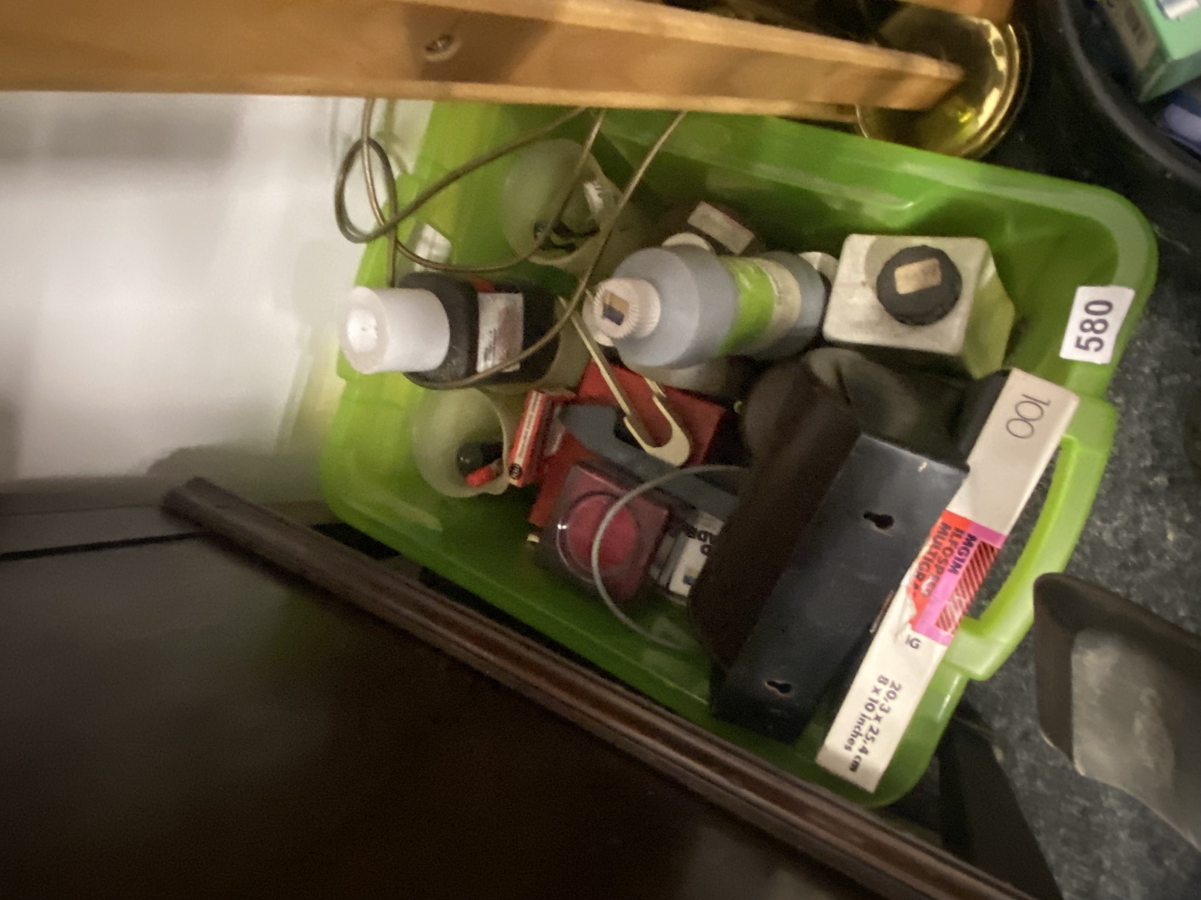 A Mixed Lot of Photographic and Hobbyist Supplies in a Lime Green Storage Bin