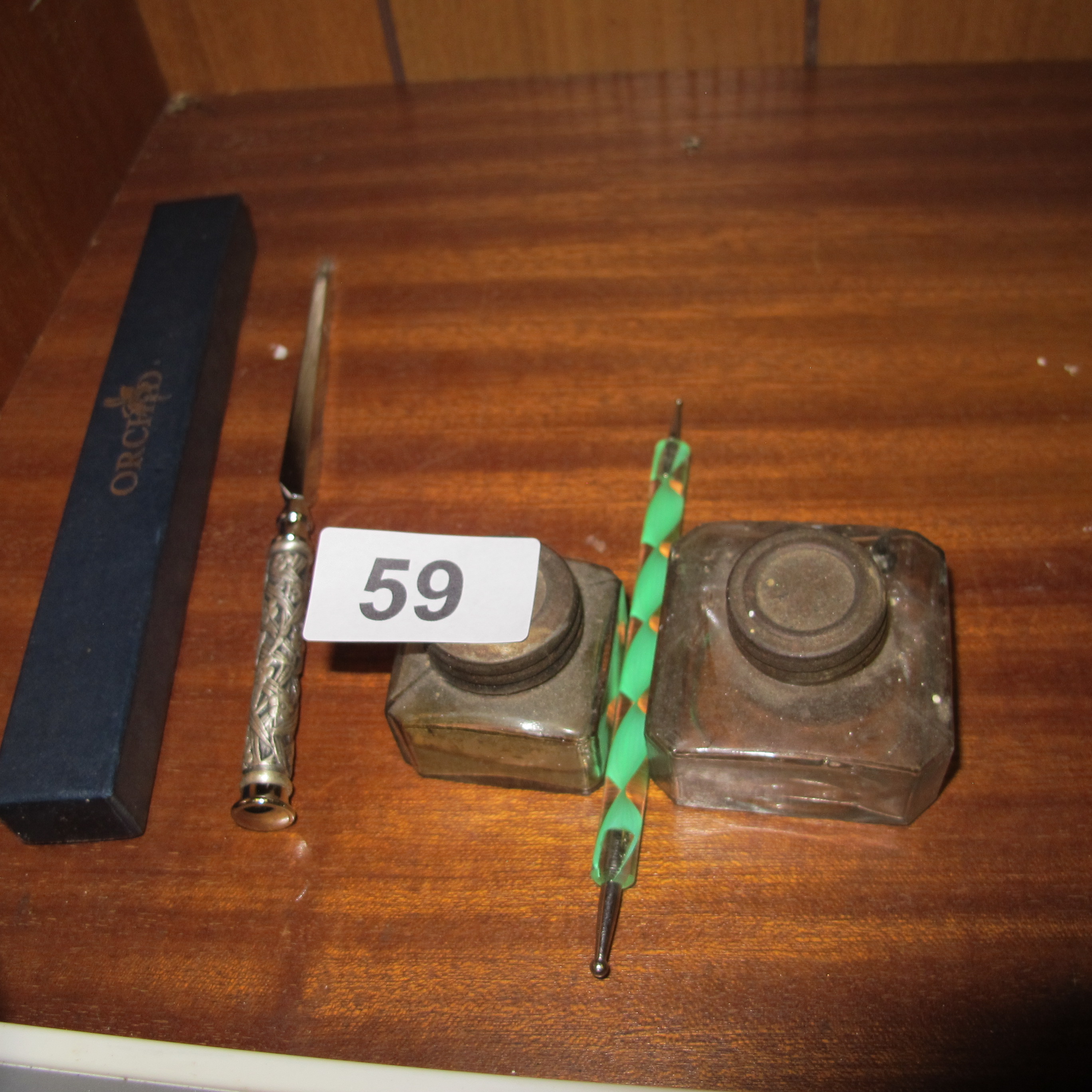 A Vintage Desk Stationery Collection, including Pair of Glass Inkwells, Letter Opener, Stylus, and Presentation Box
