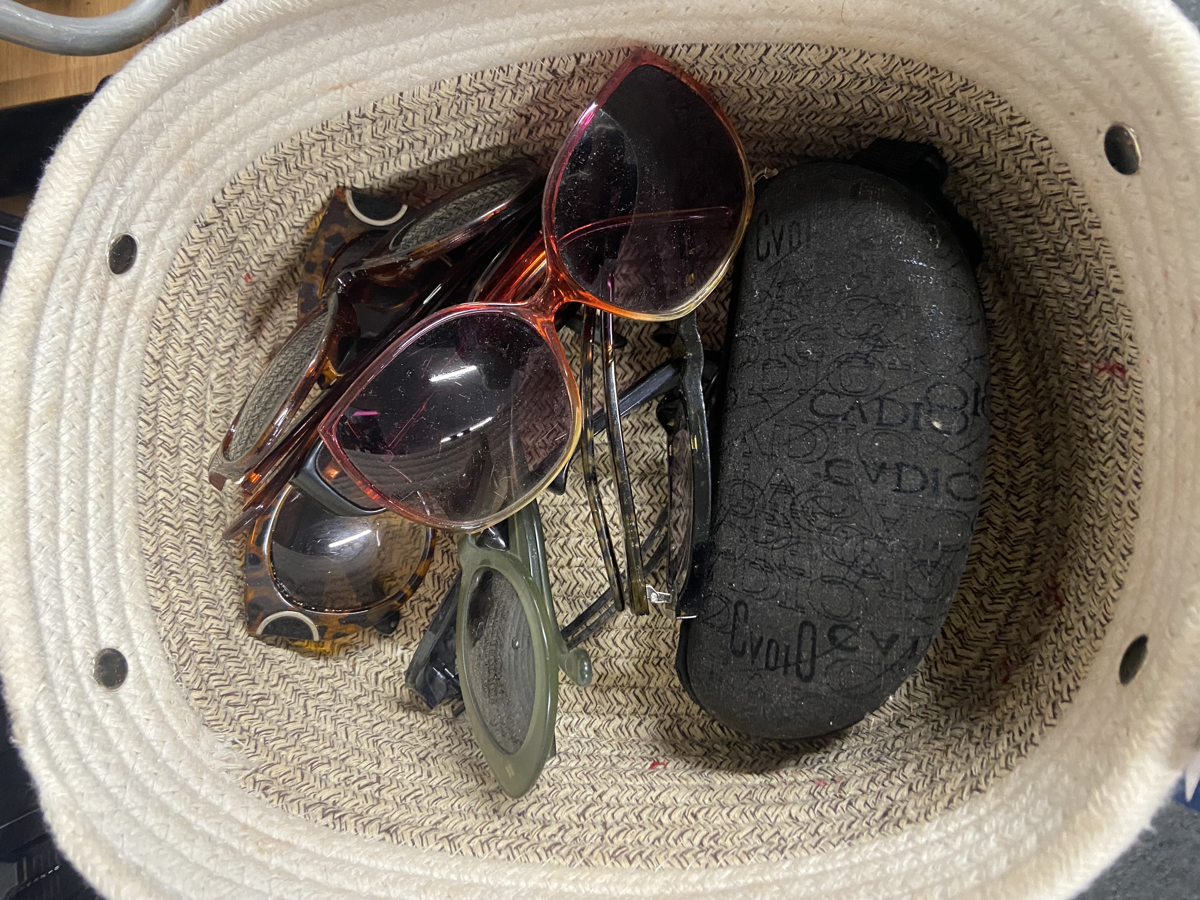 A Collection of Contemporary Plastic-Framed Sunglasses with Woven Rope Basket