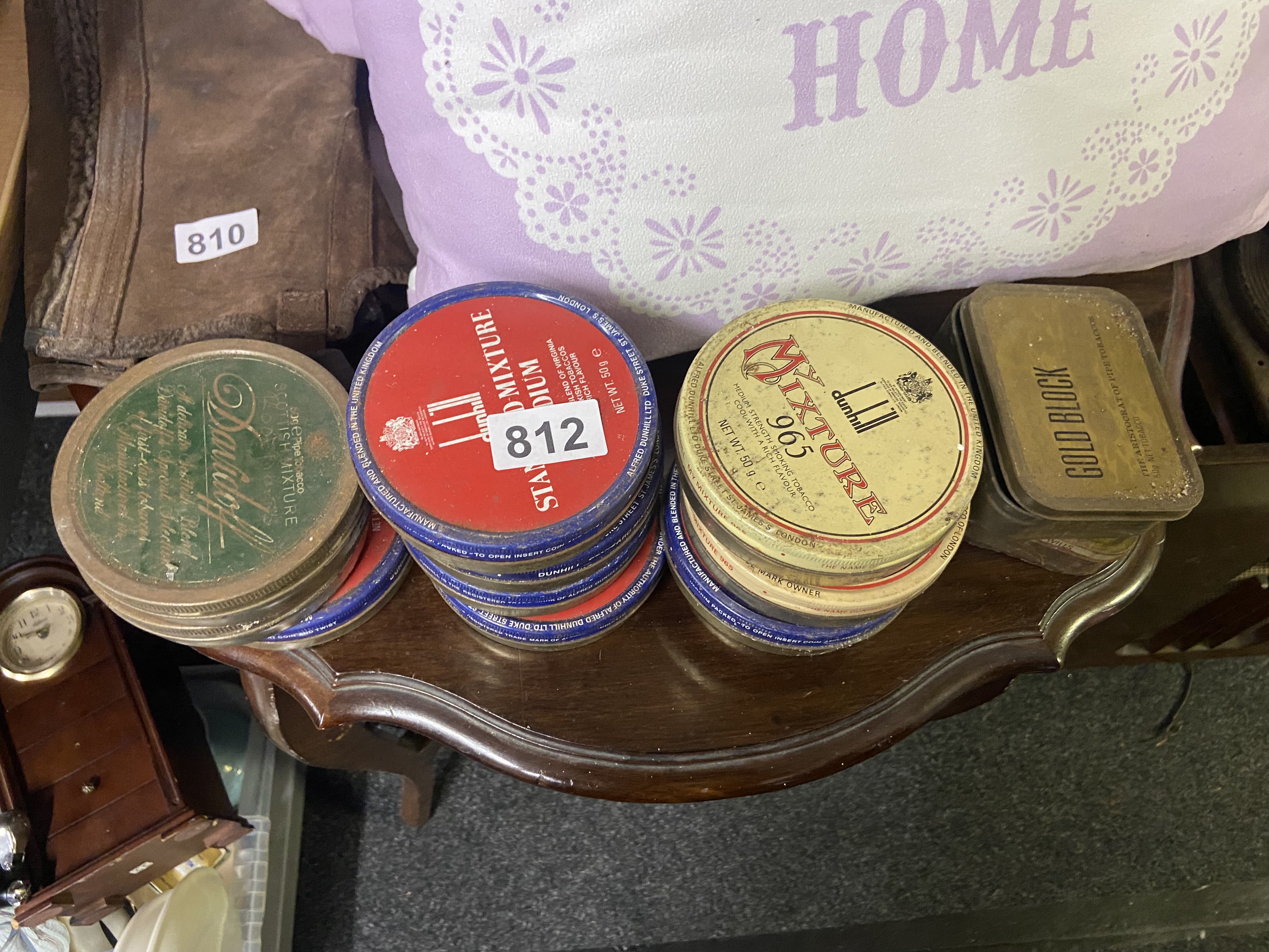 A Collection of Vintage Dunhill, Davidoff, and Gold Block Empty Pipe Tobacco Tins on a Display Stand