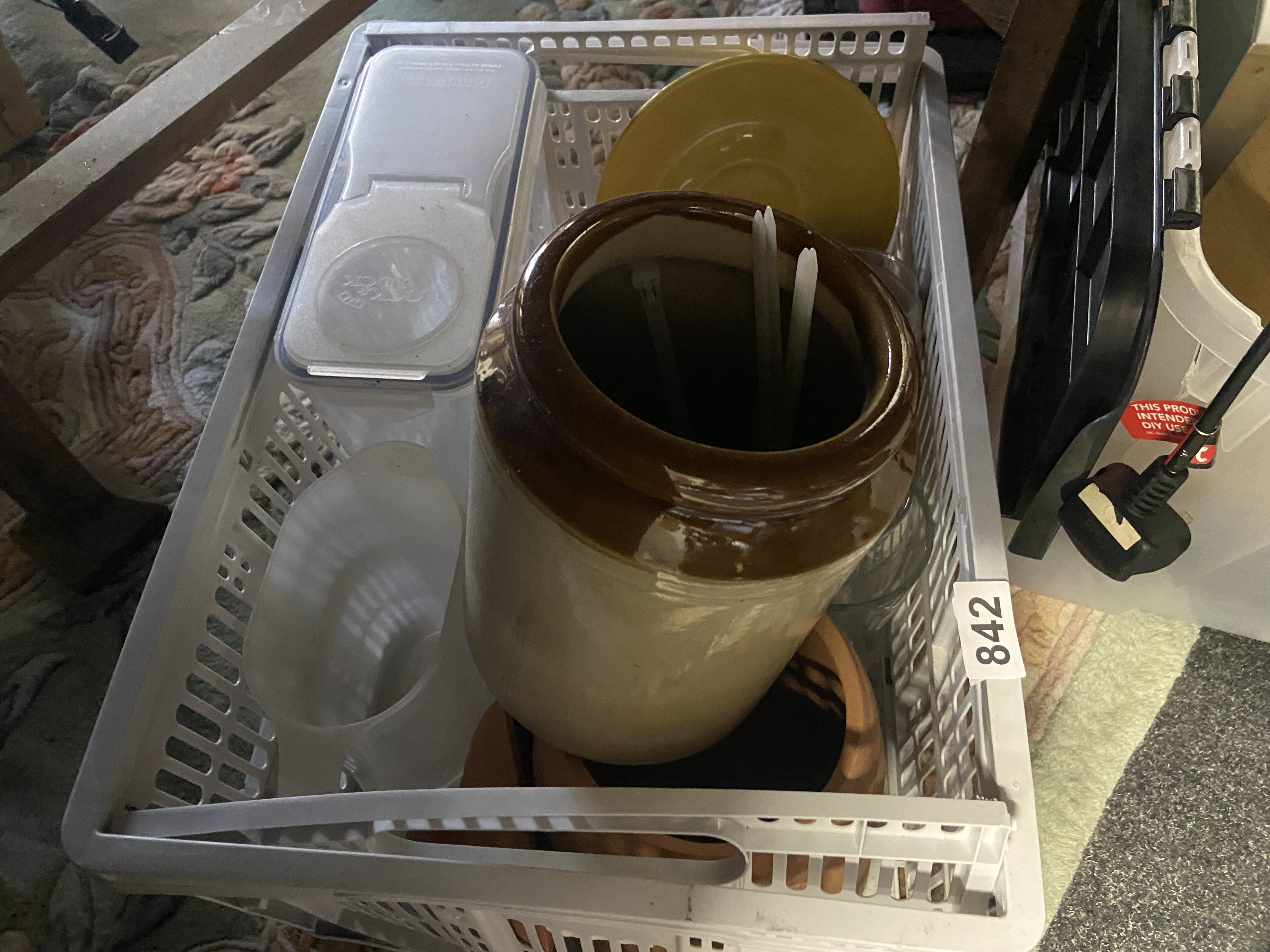 A Collection of Household Utilitarian Items, including a Two-Tone Stoneware Crock