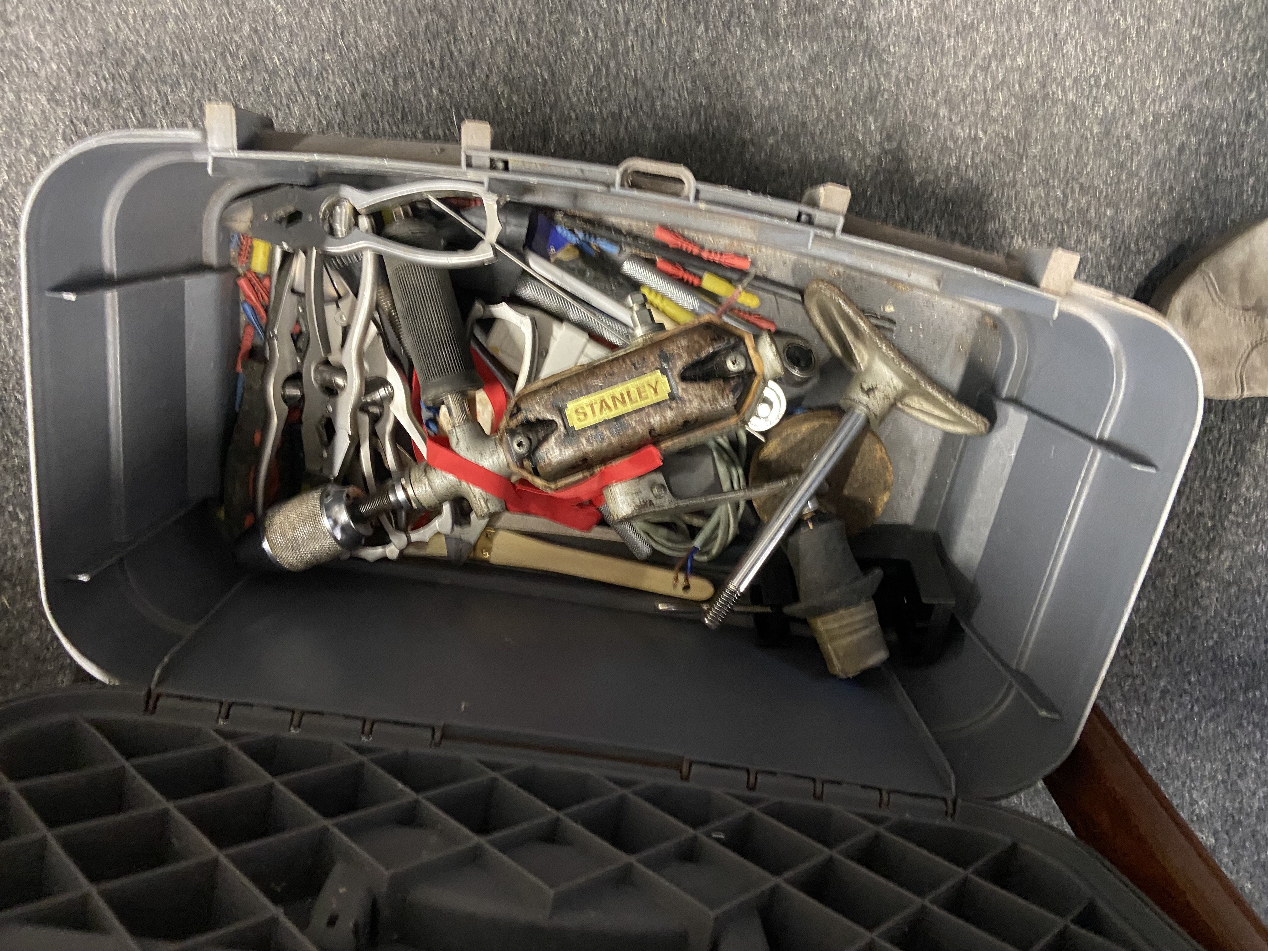 Assorted Used Hand Tools in a Grey Plastic Toolbox, including Stanley