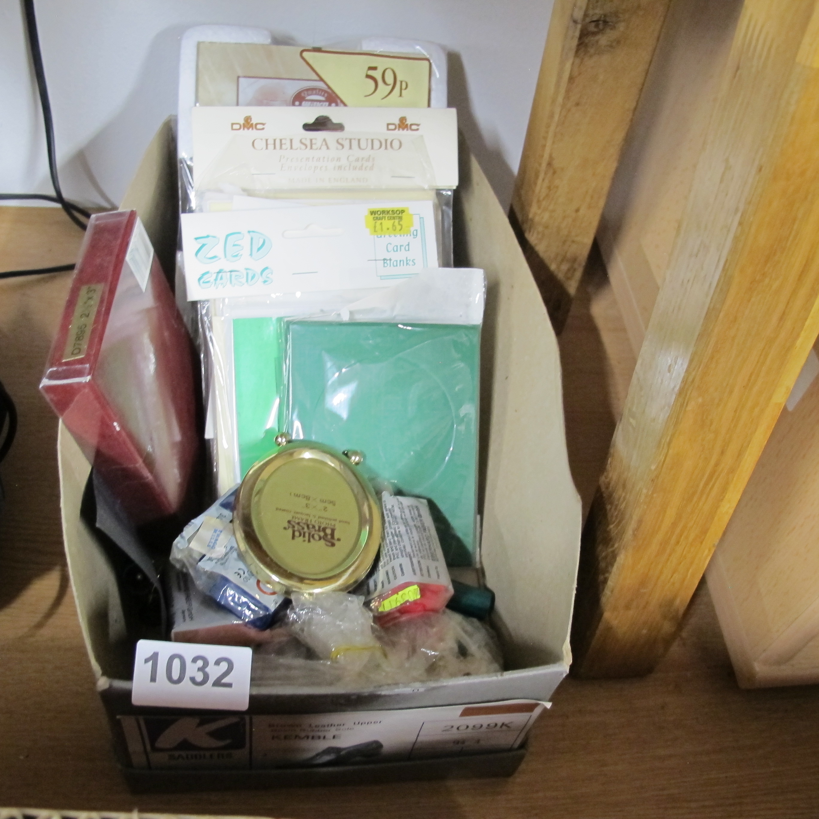 A Collection of Card Making and Craft Supplies, including DMC and Zed Cards, with a Solid Brass Photo Frame, housed in a K Saddlers Shoe Box