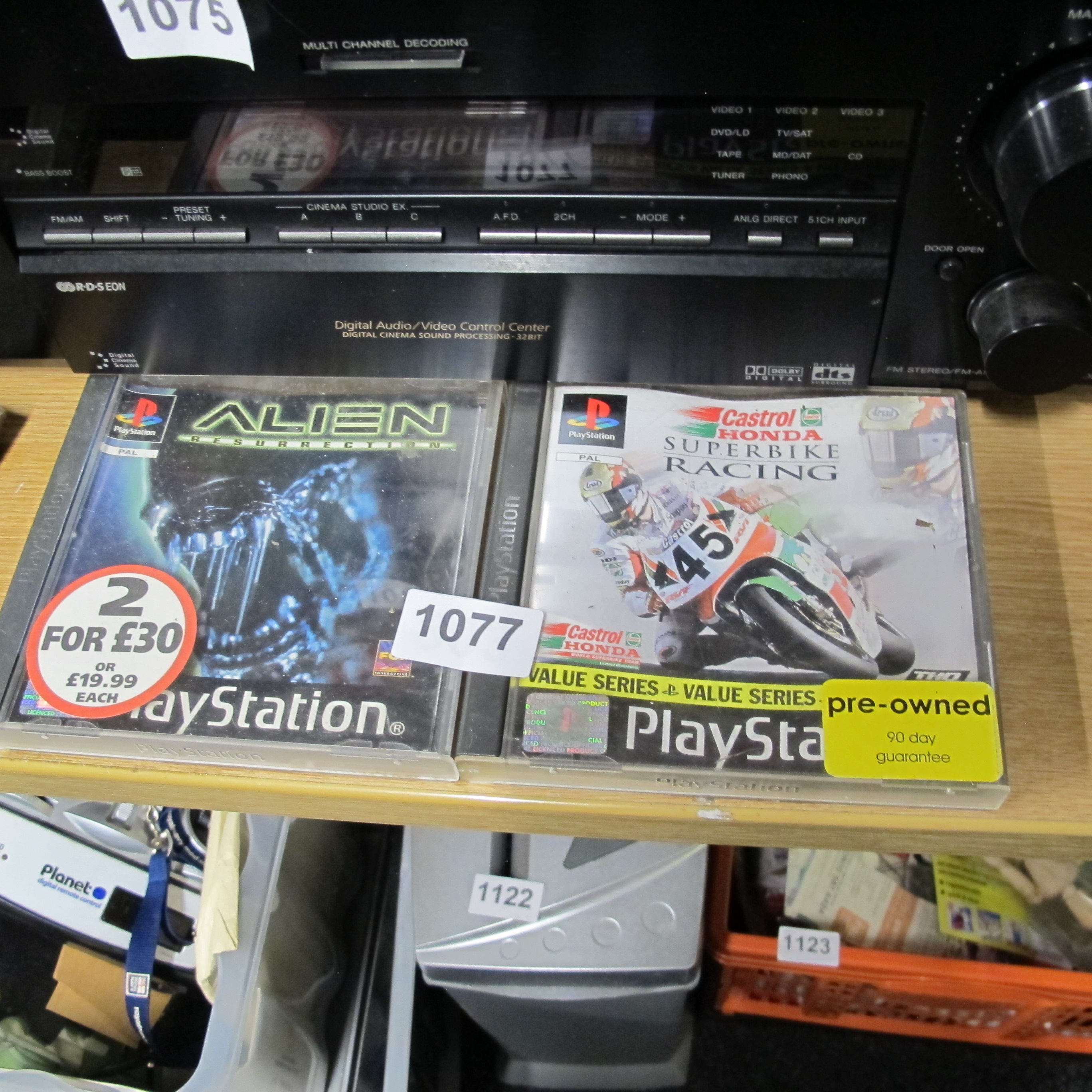 Castrol Honda Superbike Racing (PlayStation 1), Alien Resurrection (PlayStation 1), and a Sony Digital Audio/Video Control Center