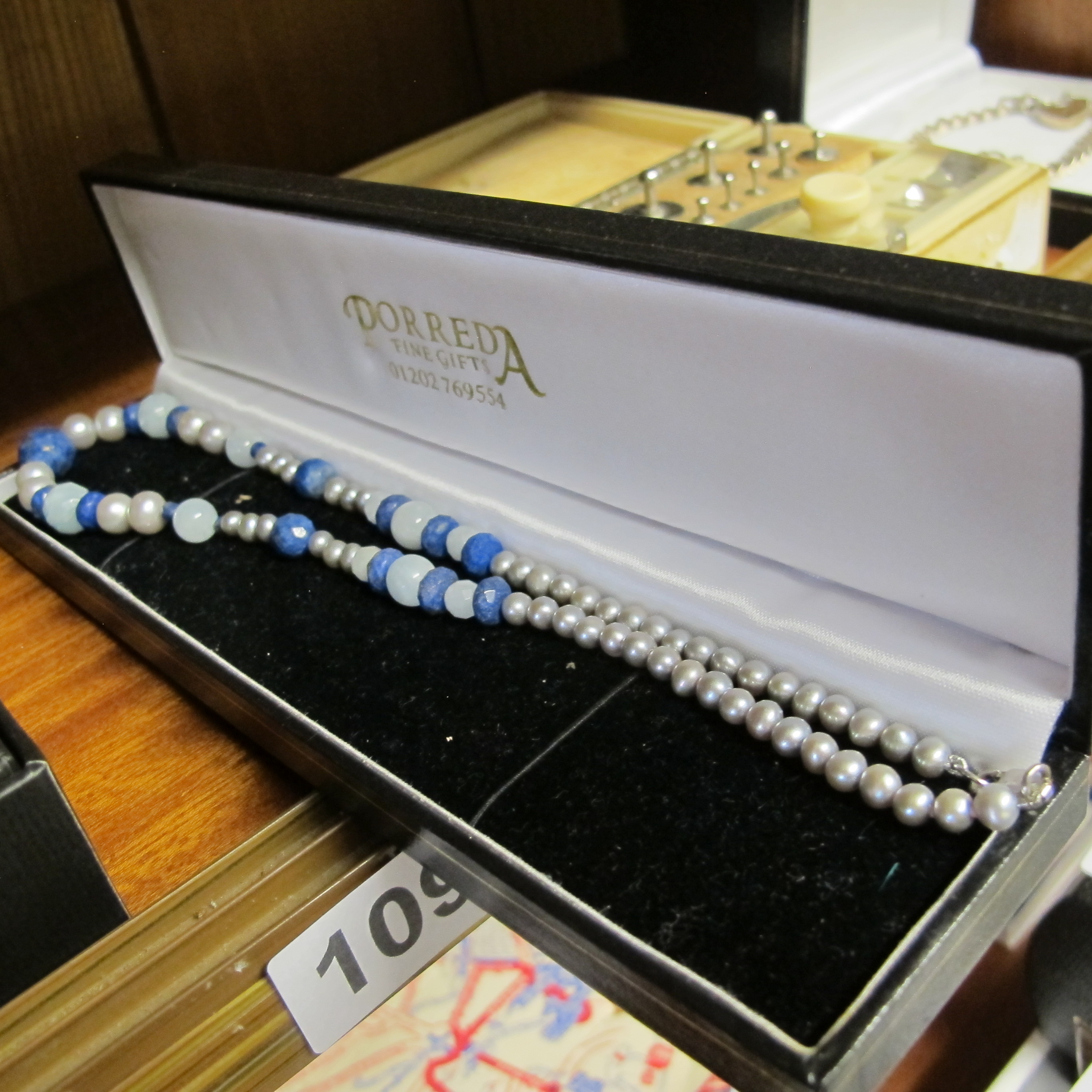 A Pair of Beaded Necklaces with Off-White and Blue Beads on a 925 stamped necklace