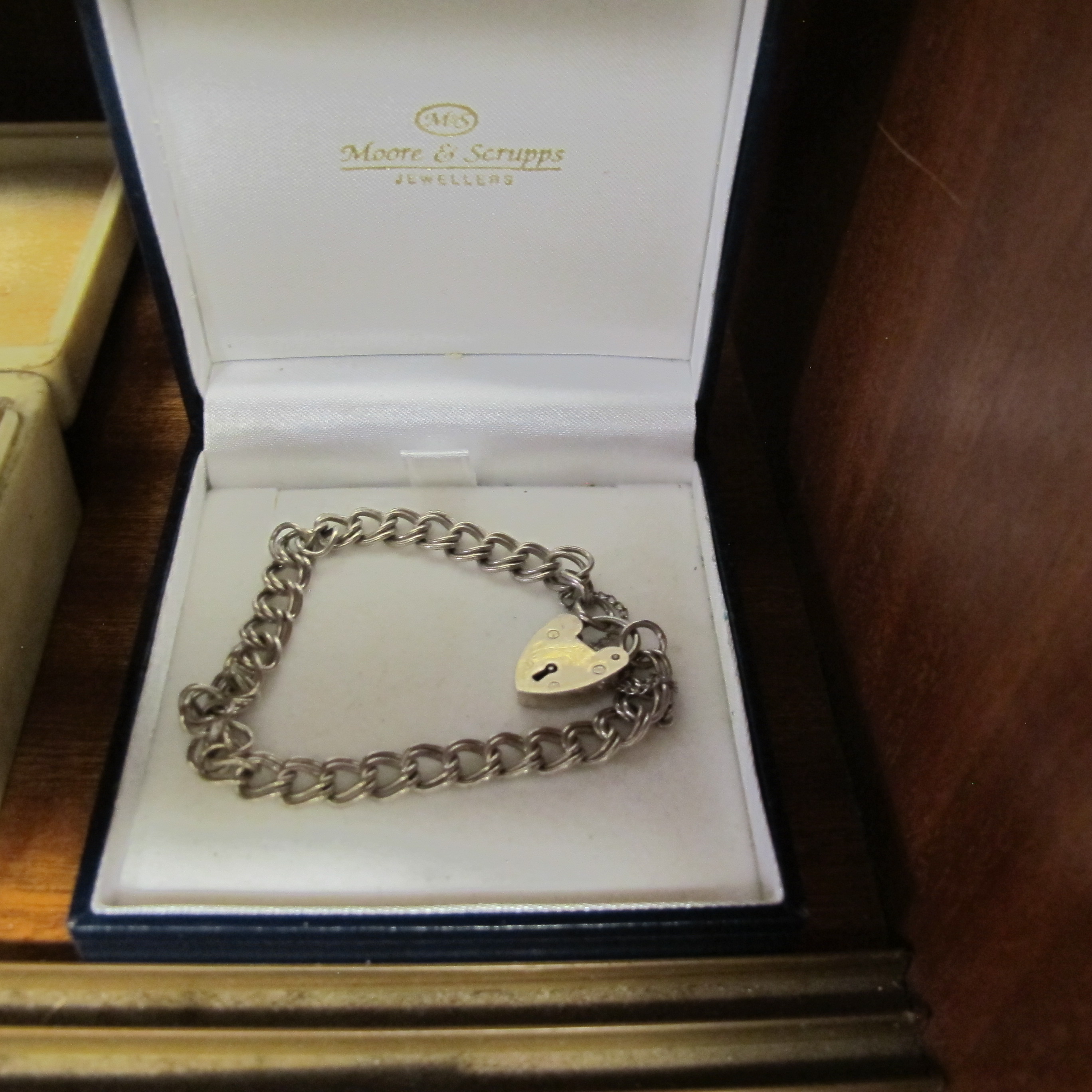 Vintage Sterling Silver Curb Link Bracelet with Heart Padlock, in Moore & Scrupps Box. Weight is 14 grams