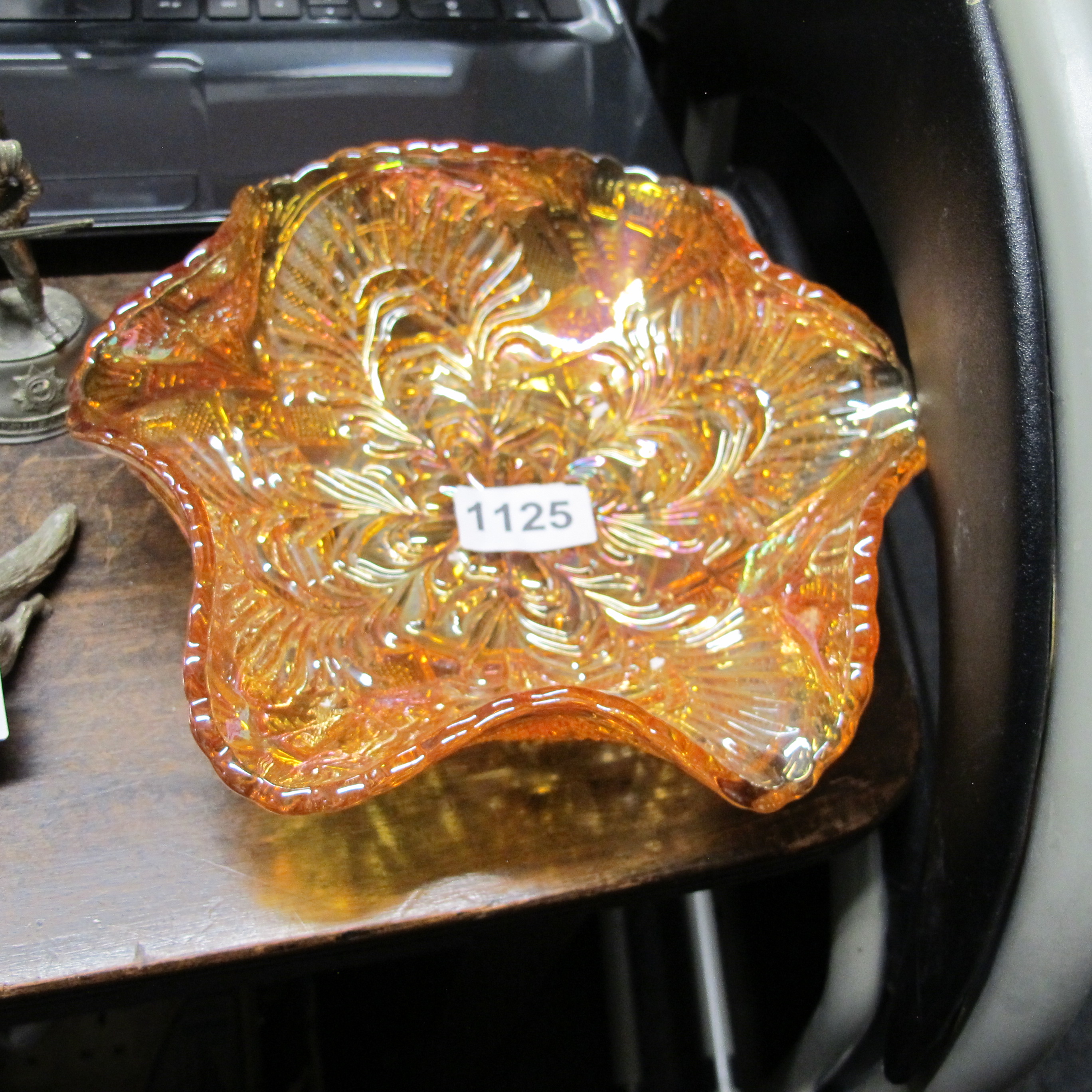 Brockwitz Marigold Carnival Glass ‘Curved Star and Headdress’ Ruffled Bowl