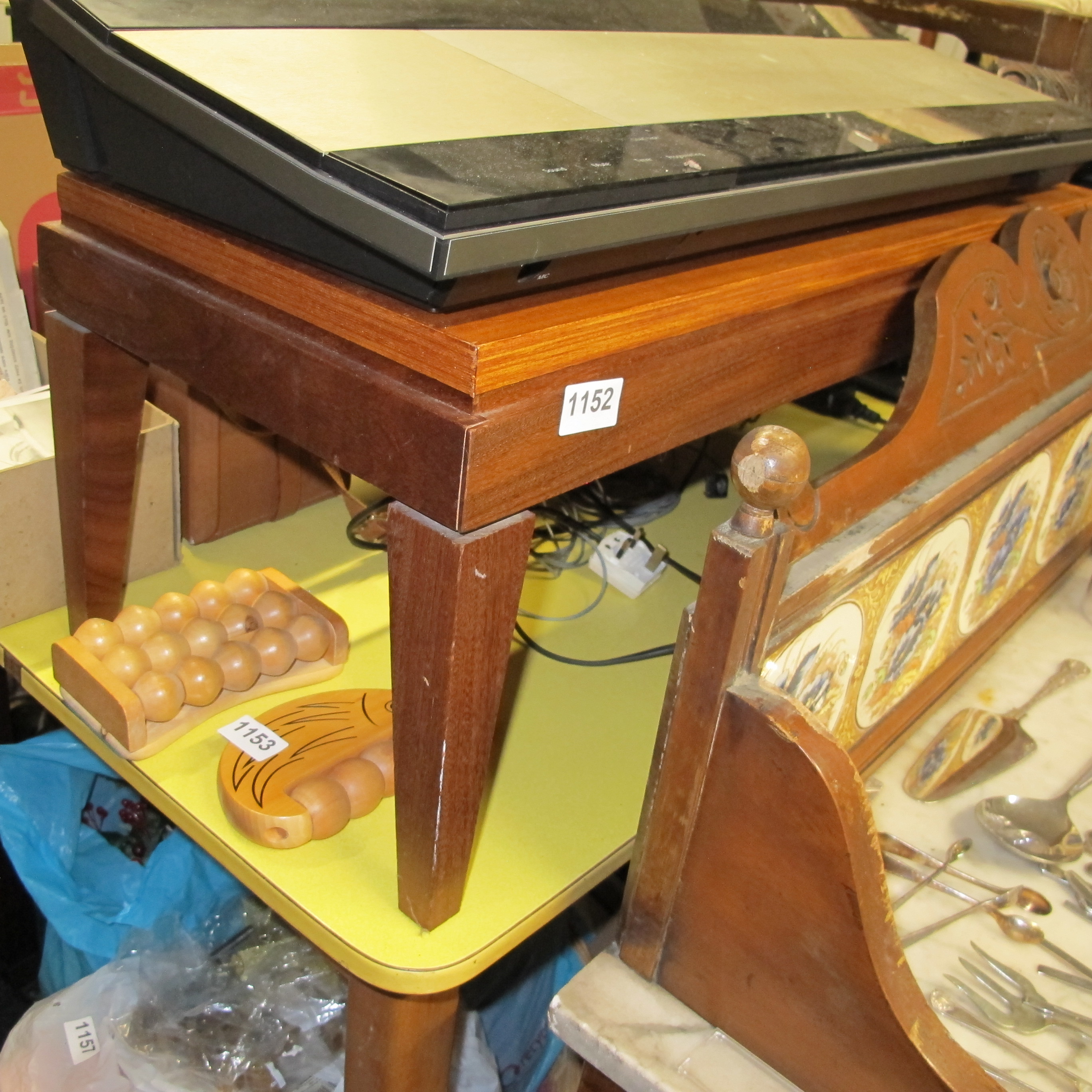 A Modern Electronic Audio Component on Stand, with a Traditional Carved Wooden Panel and Two Massage Rollers
