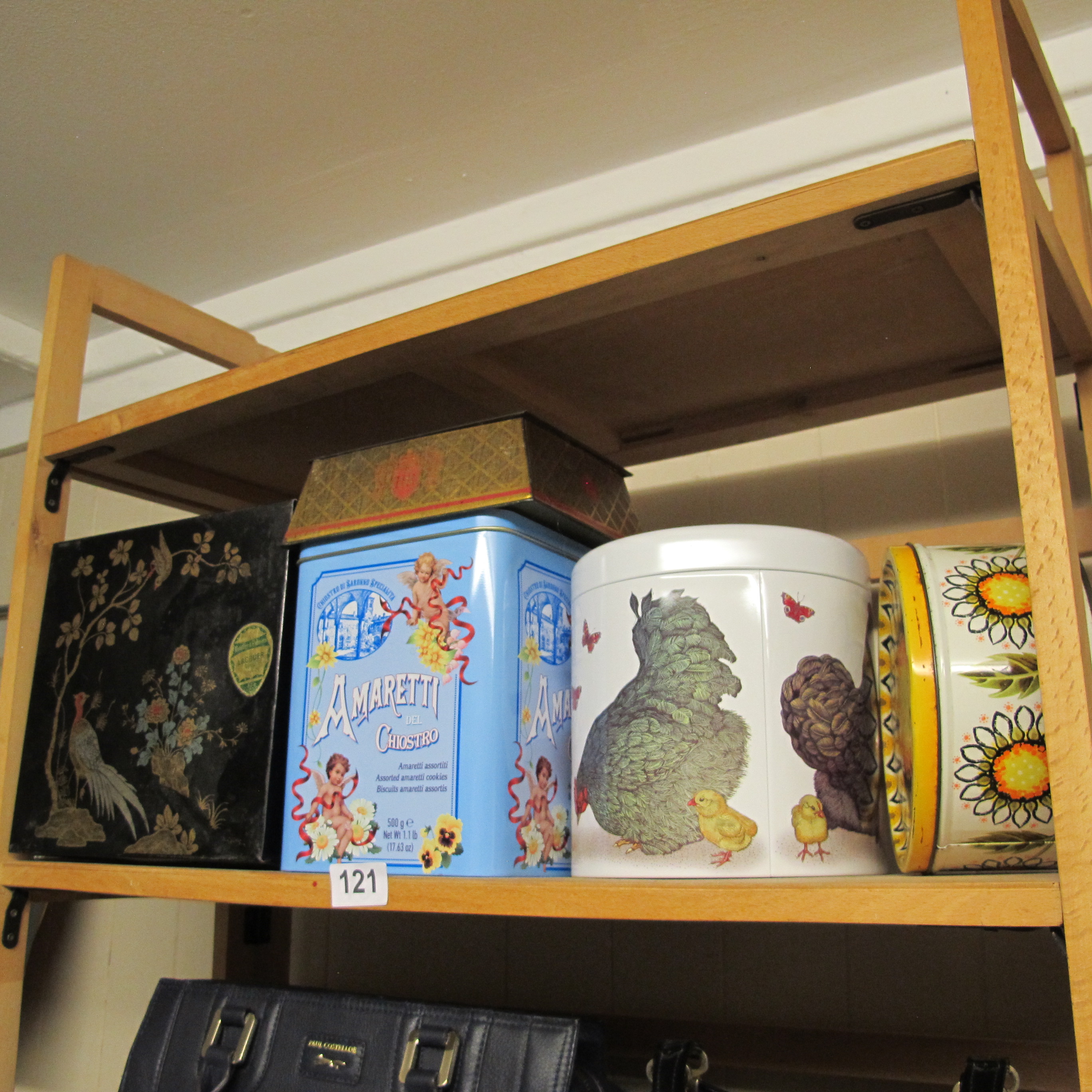 A Collection of Decorative Tins and a Lacquered Box, including a Vanessa Lubach ‘Chickens’ Canister