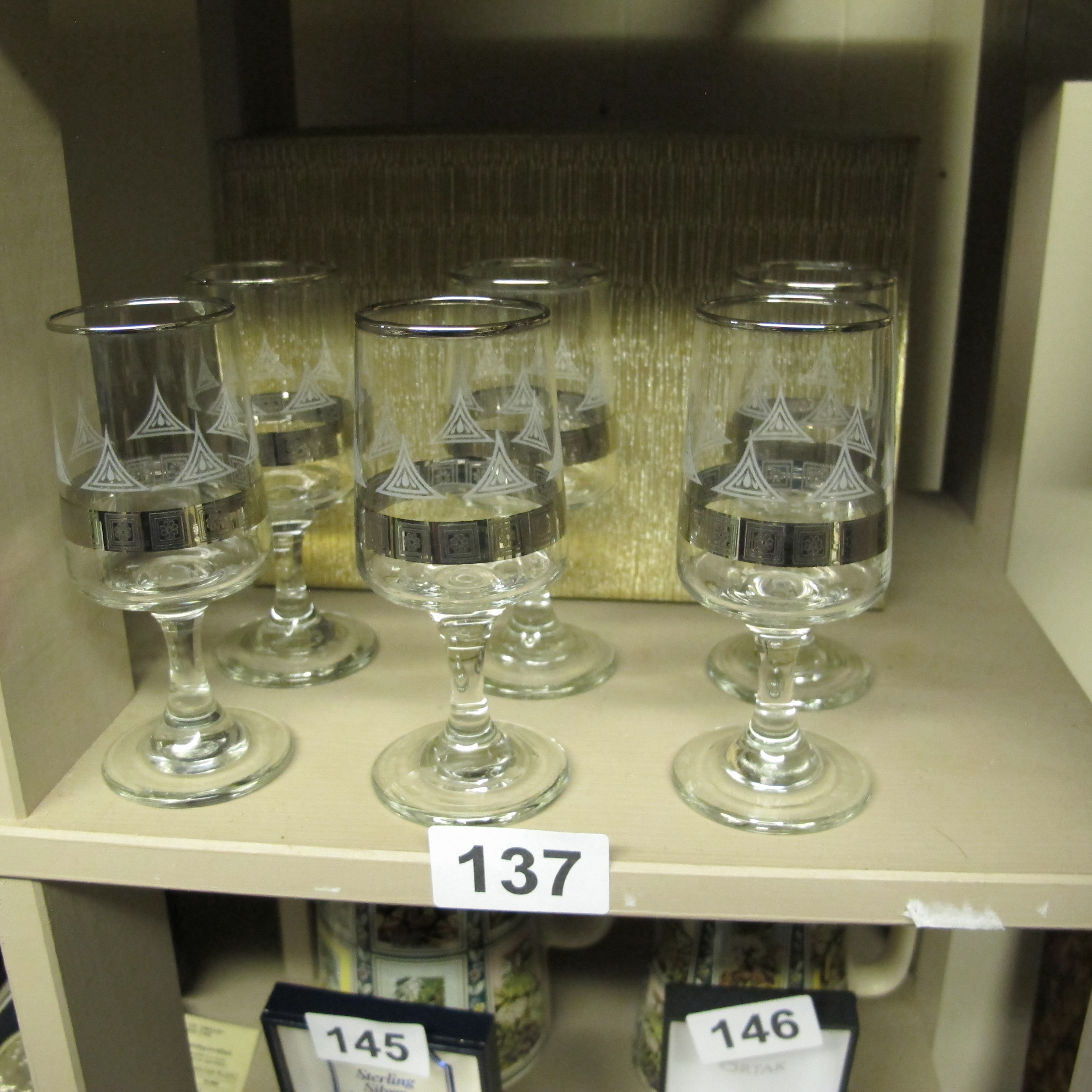 A Set of Six Dema Glass Sherry Glasses with Silver-Toned Band and Geometric Etching