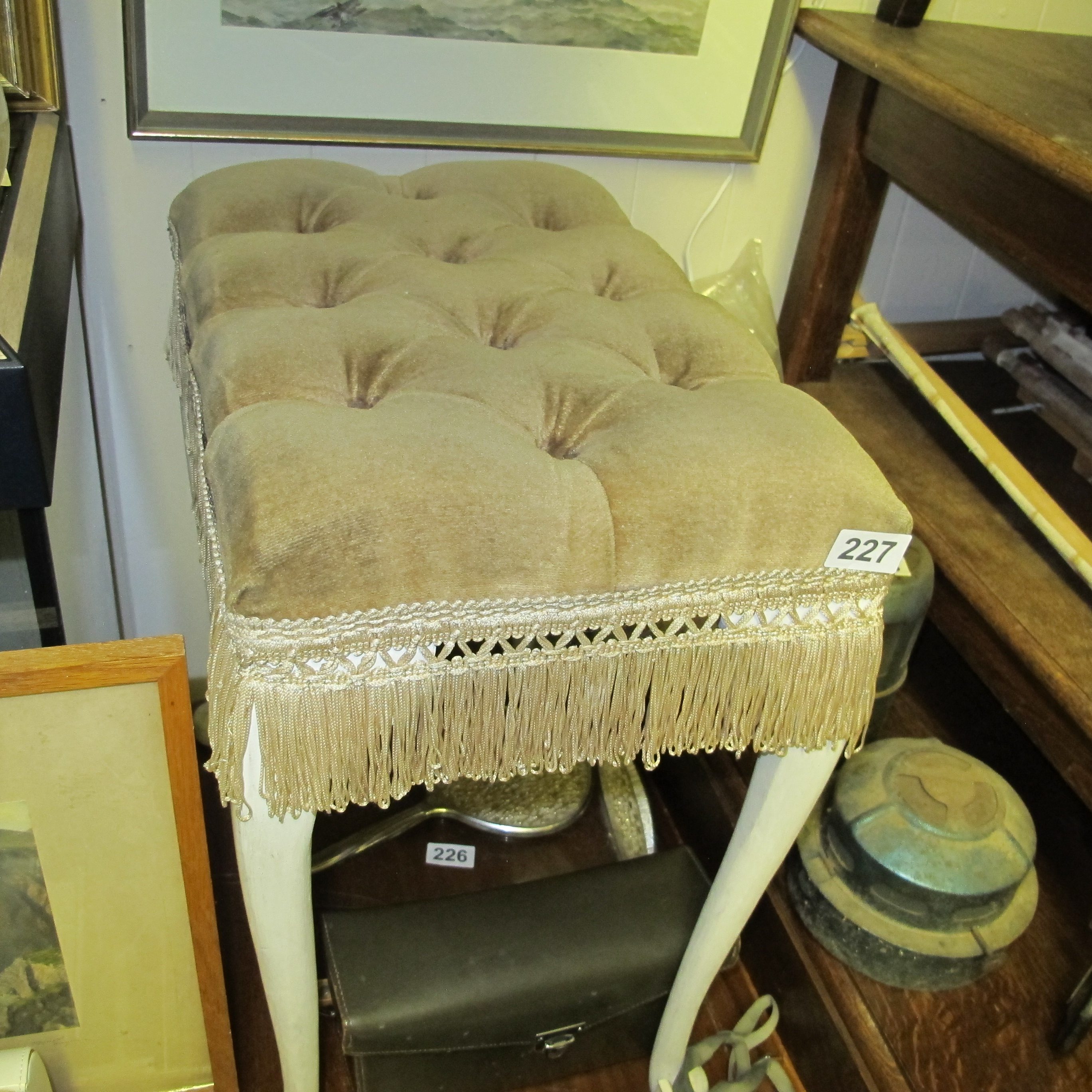 A Vintage Tufted Velvet Upholstered Ottoman with Fringe Trim