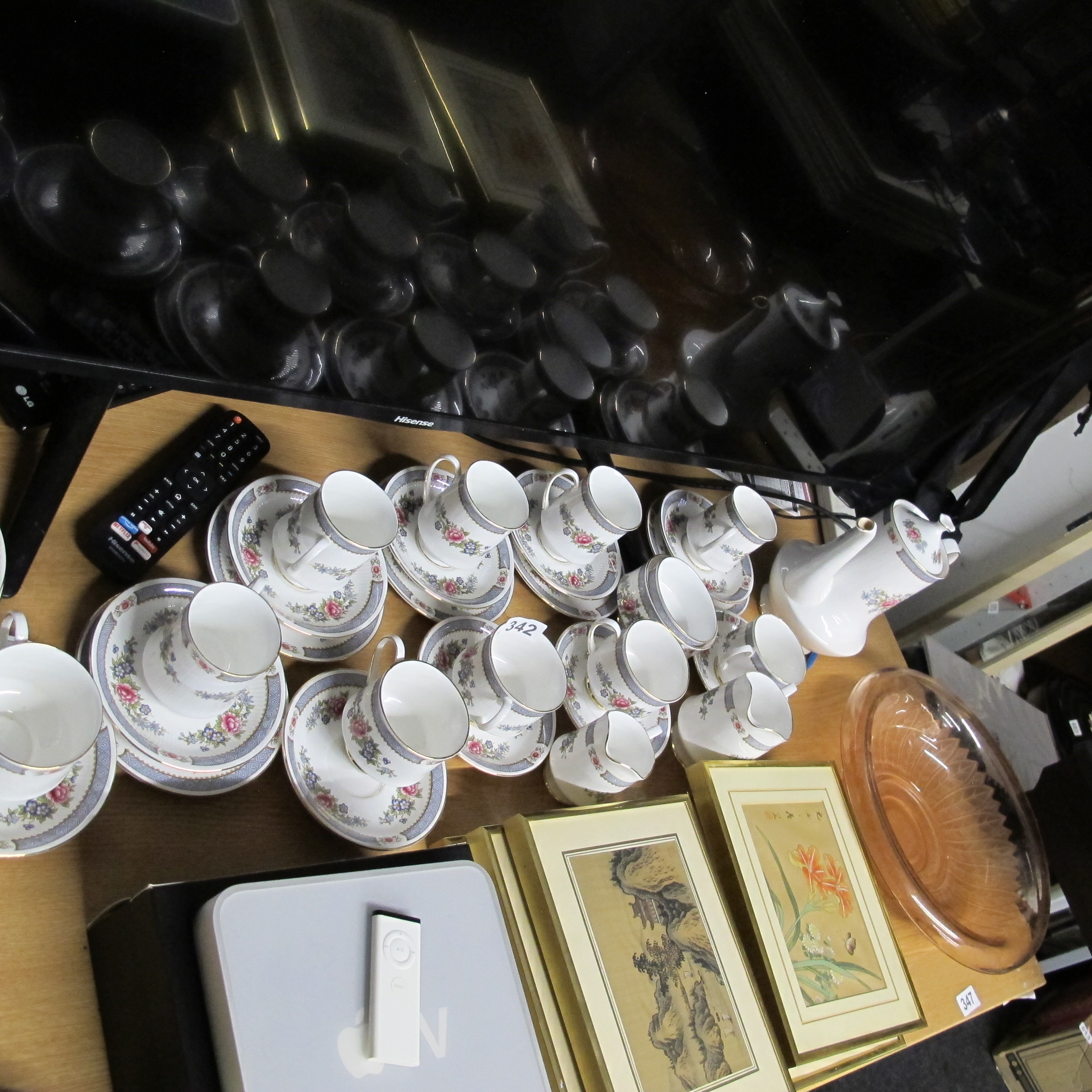 A Collection of Bone China Tea Wares, a Peach-Tinted Glass Bowl, and Two East Asian Style Framed Artworks