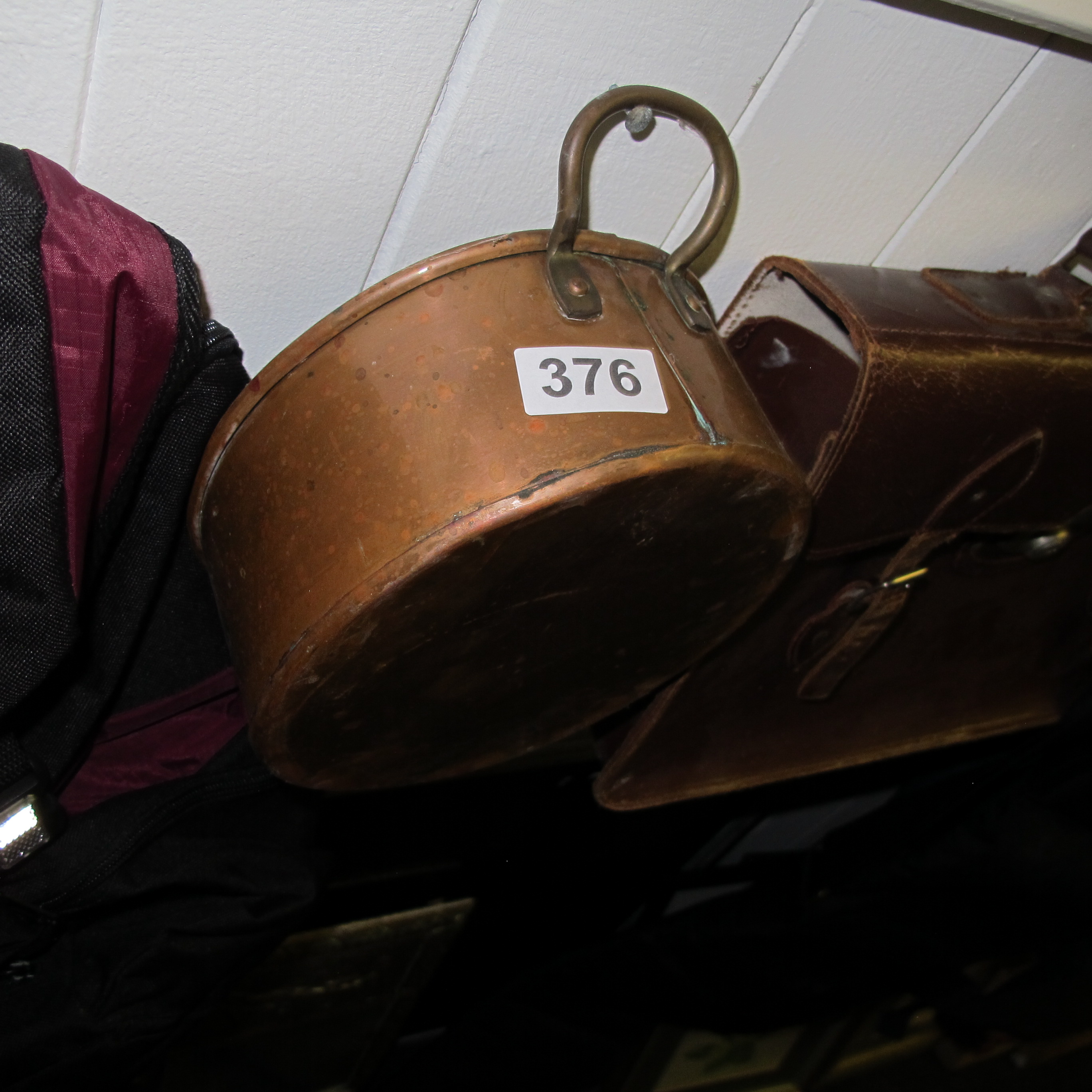 An Antique Patinated Copper Pot with Brass Swing Handle