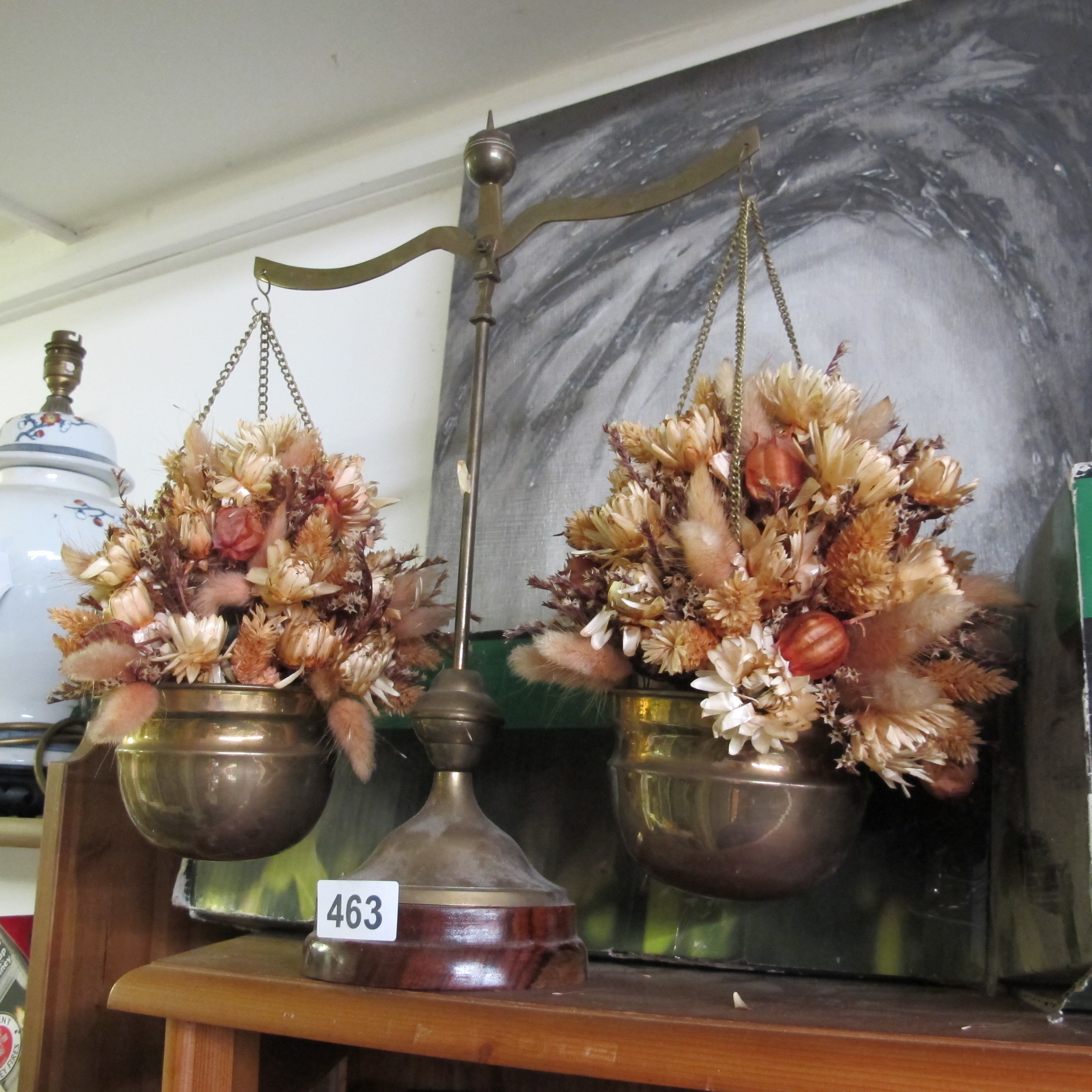 A Decorative Brass Balance Scale with Dried Floral Arrangements