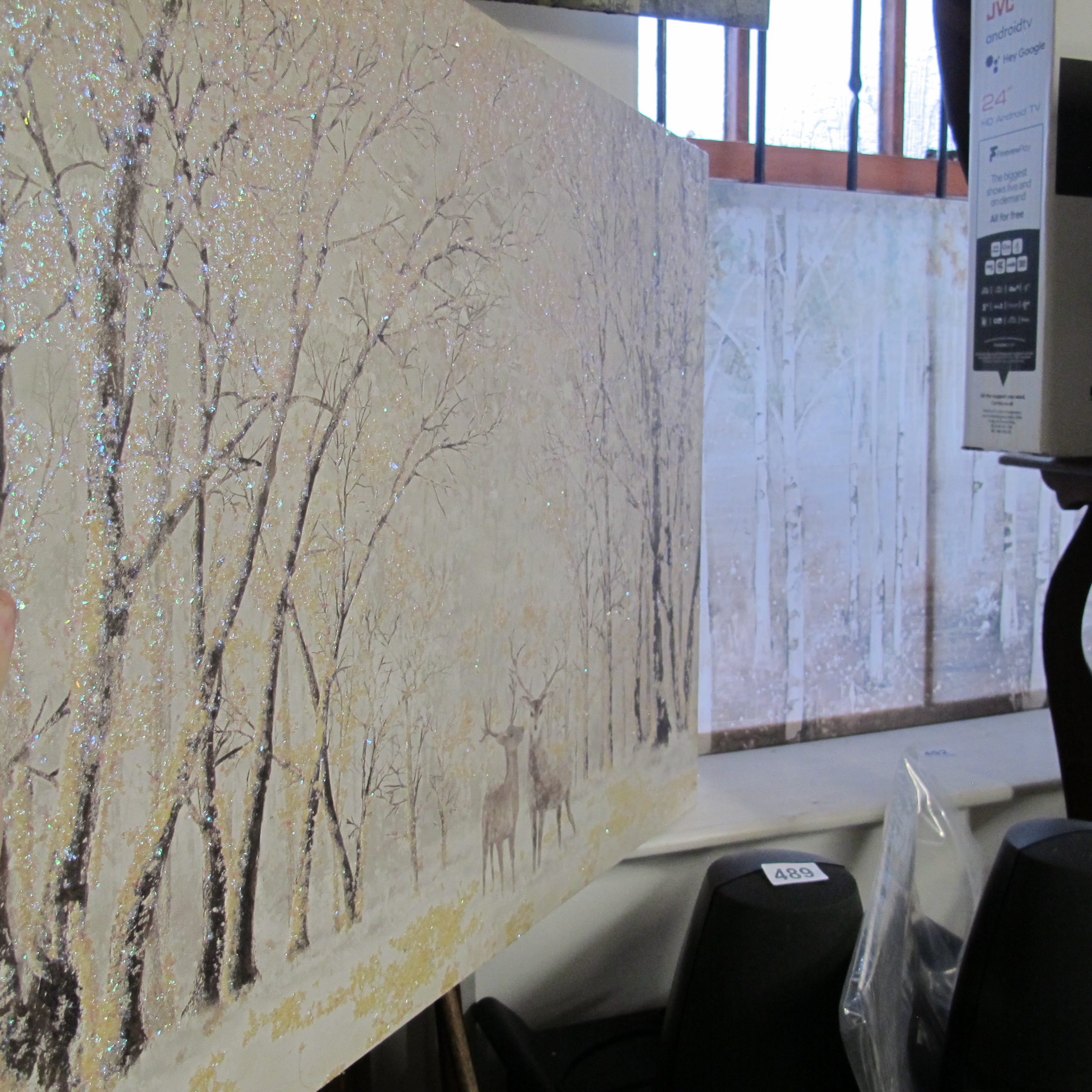 A Large-Format Glitter-Embellished Winter Forest Landscape with Deer