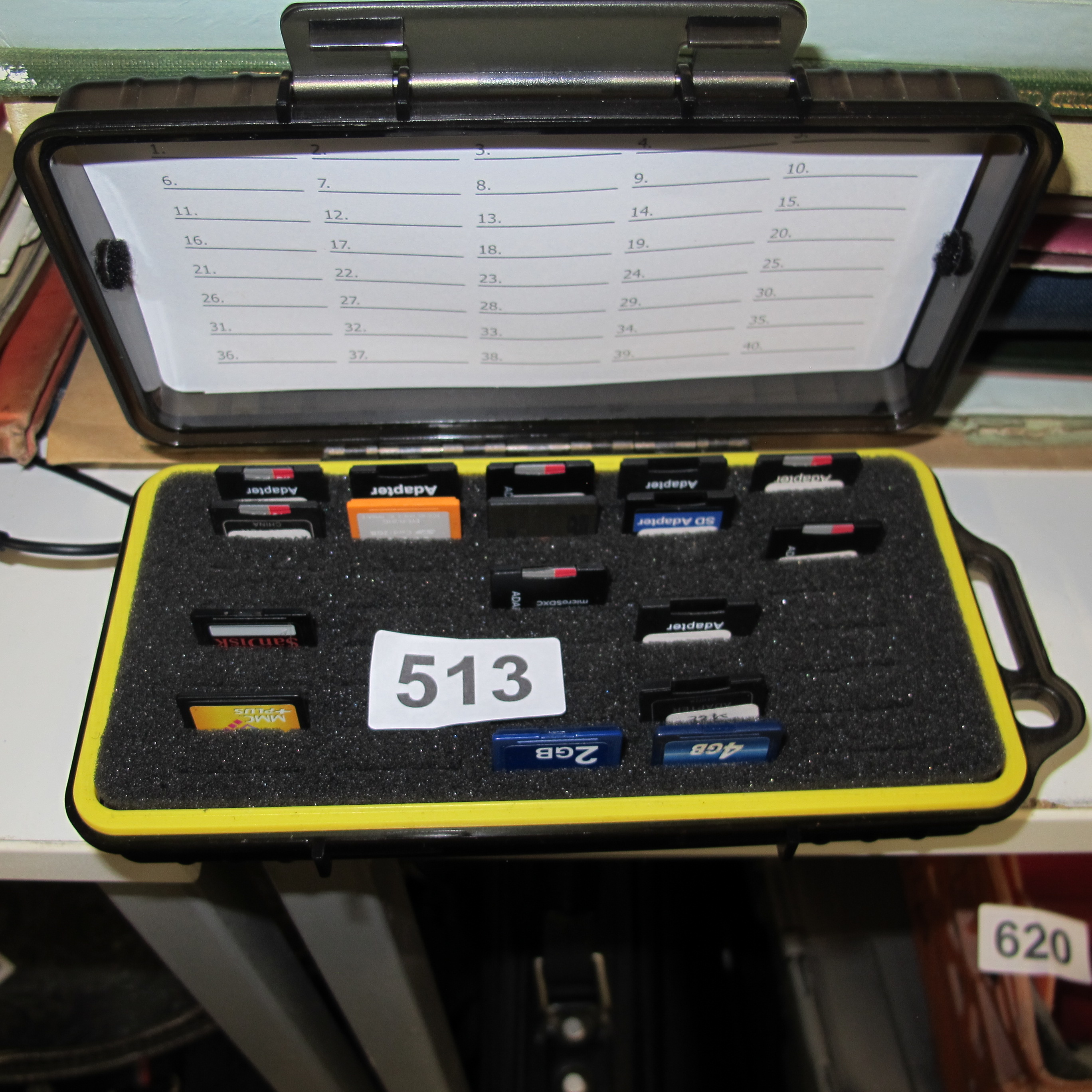 A Modern Black and Yellow Hard-Shell Memory Card Storage Case with Assorted Memory Cards and Adapters