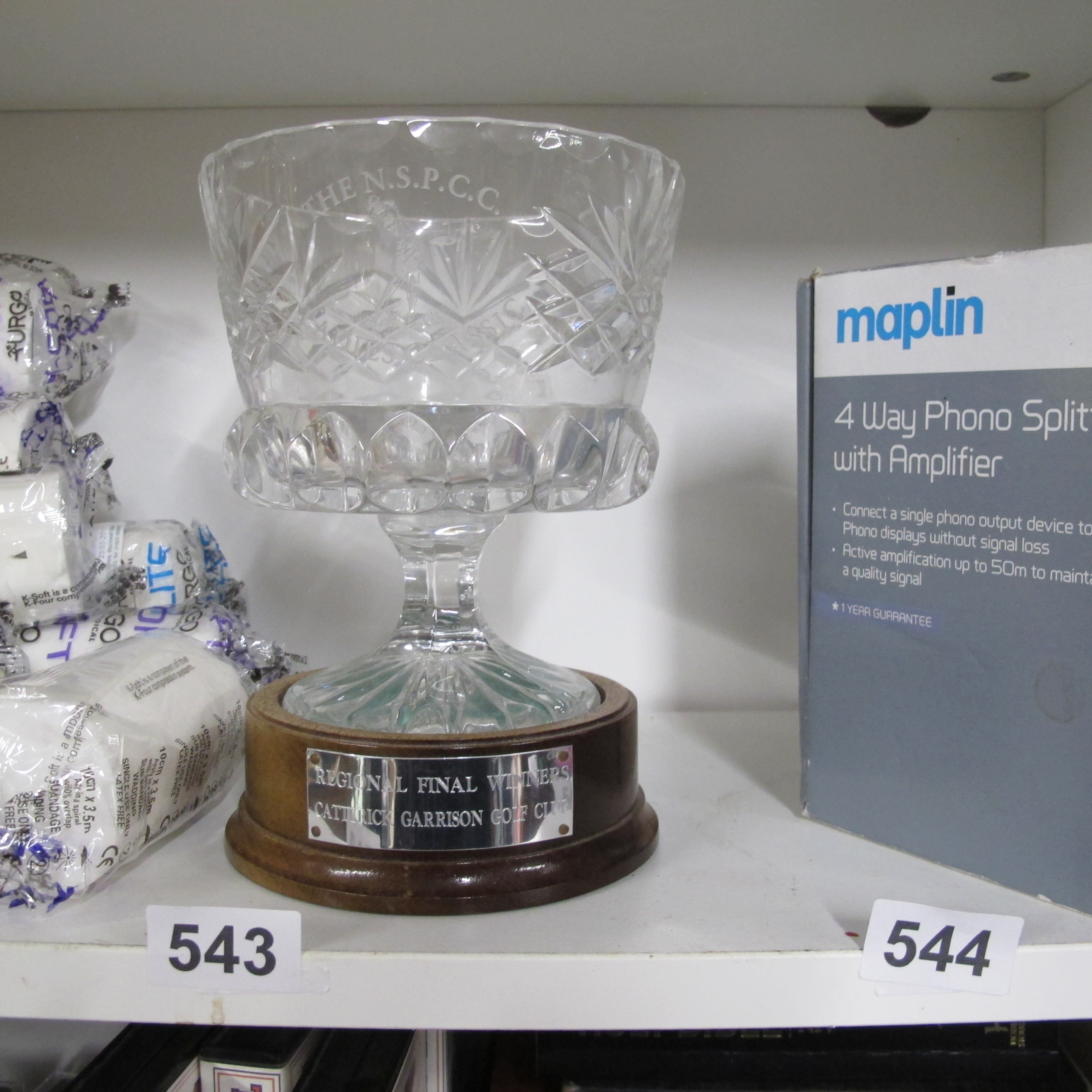 A Cut Crystal Trophy Cup on Wooden Plinth, Engraved for the N.S.P.C.C. and Carrick Garrison Golf Club