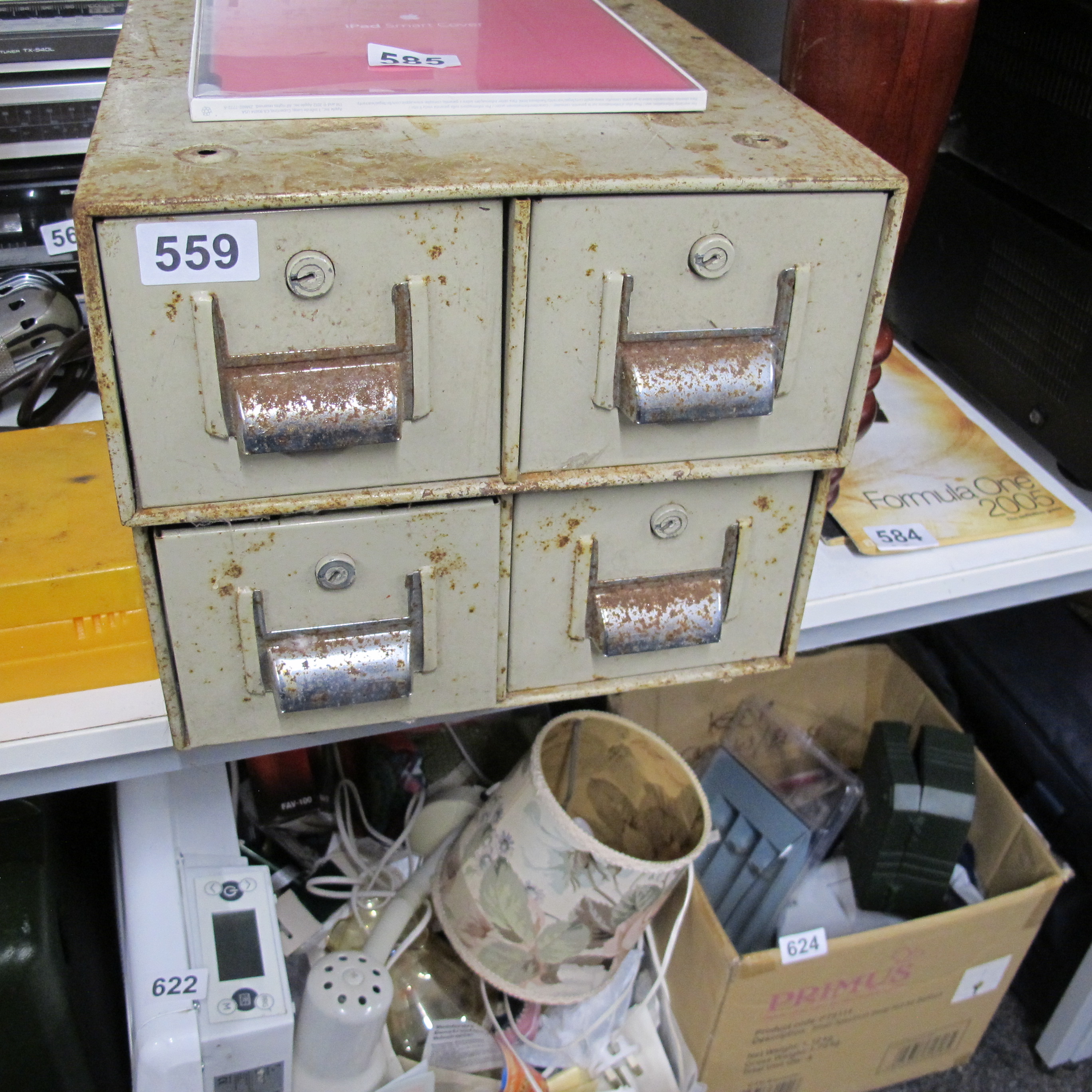 A Vintage Industrial Four-Drawer Metal Filing Cabinet with various contents