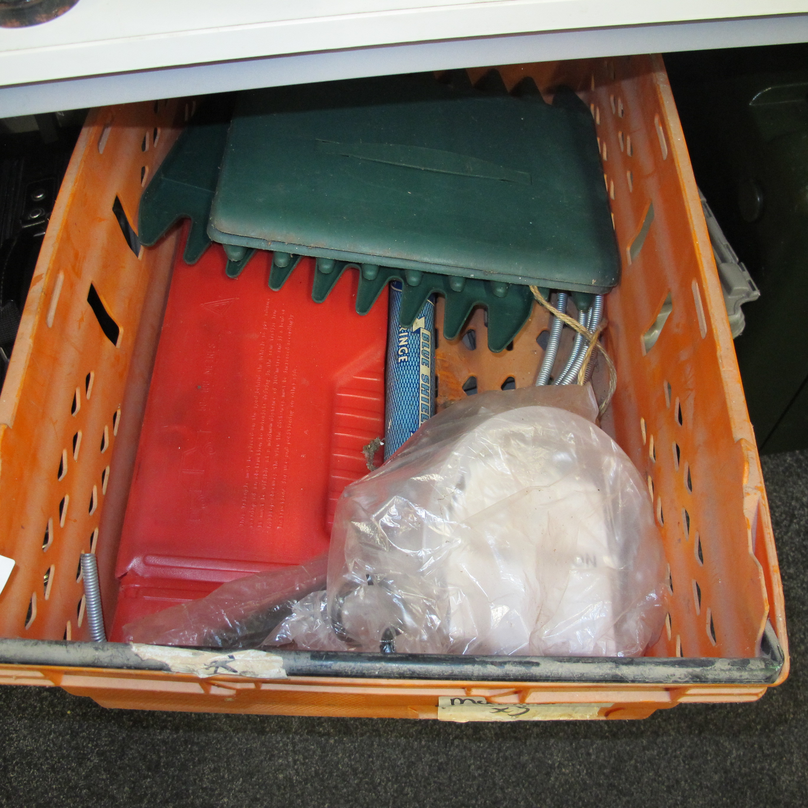 A Collection of Utilitarian Garage and Household Items in a Plastic Crate