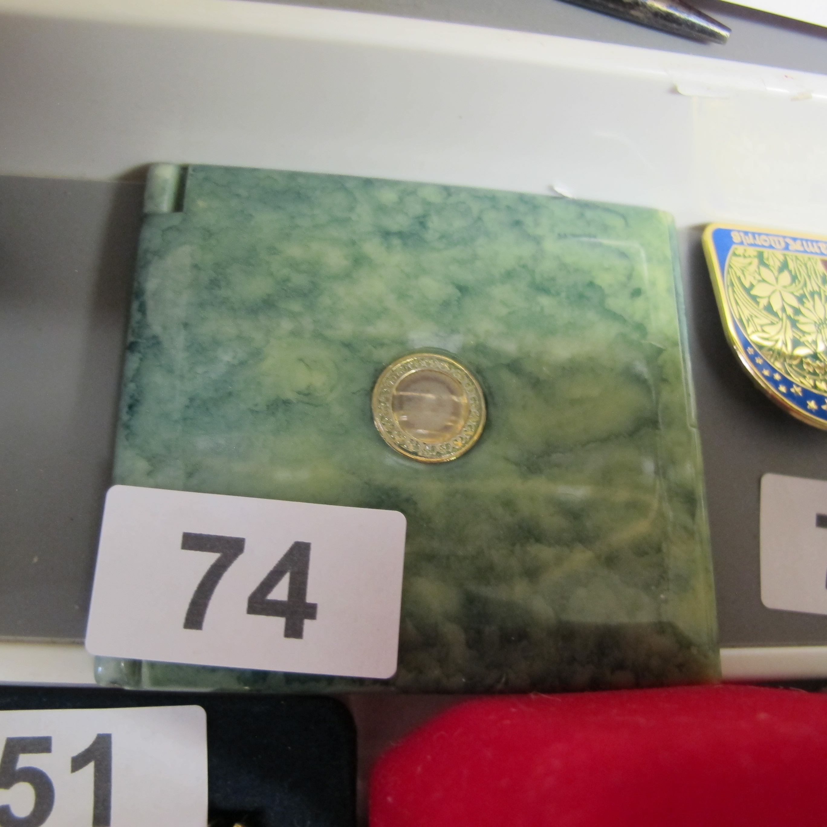 A Vintage Mexican Hardstone composite and Brass Inlaid compact mirror with Aztec Medallion badge