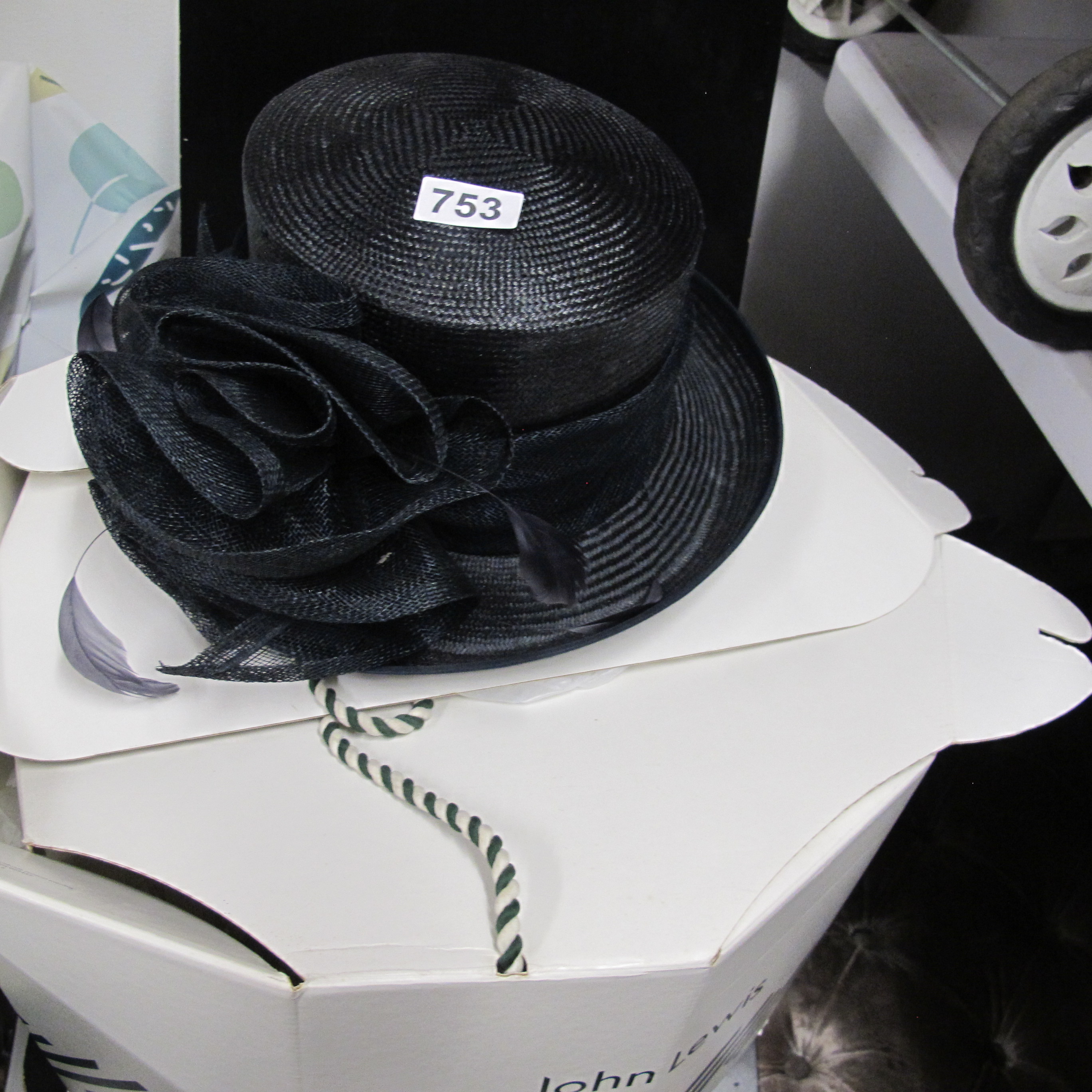 A Contemporary Black Sinamay Fascinator/Cocktail Hat with Floral and Feather Embellishment, John Lewis