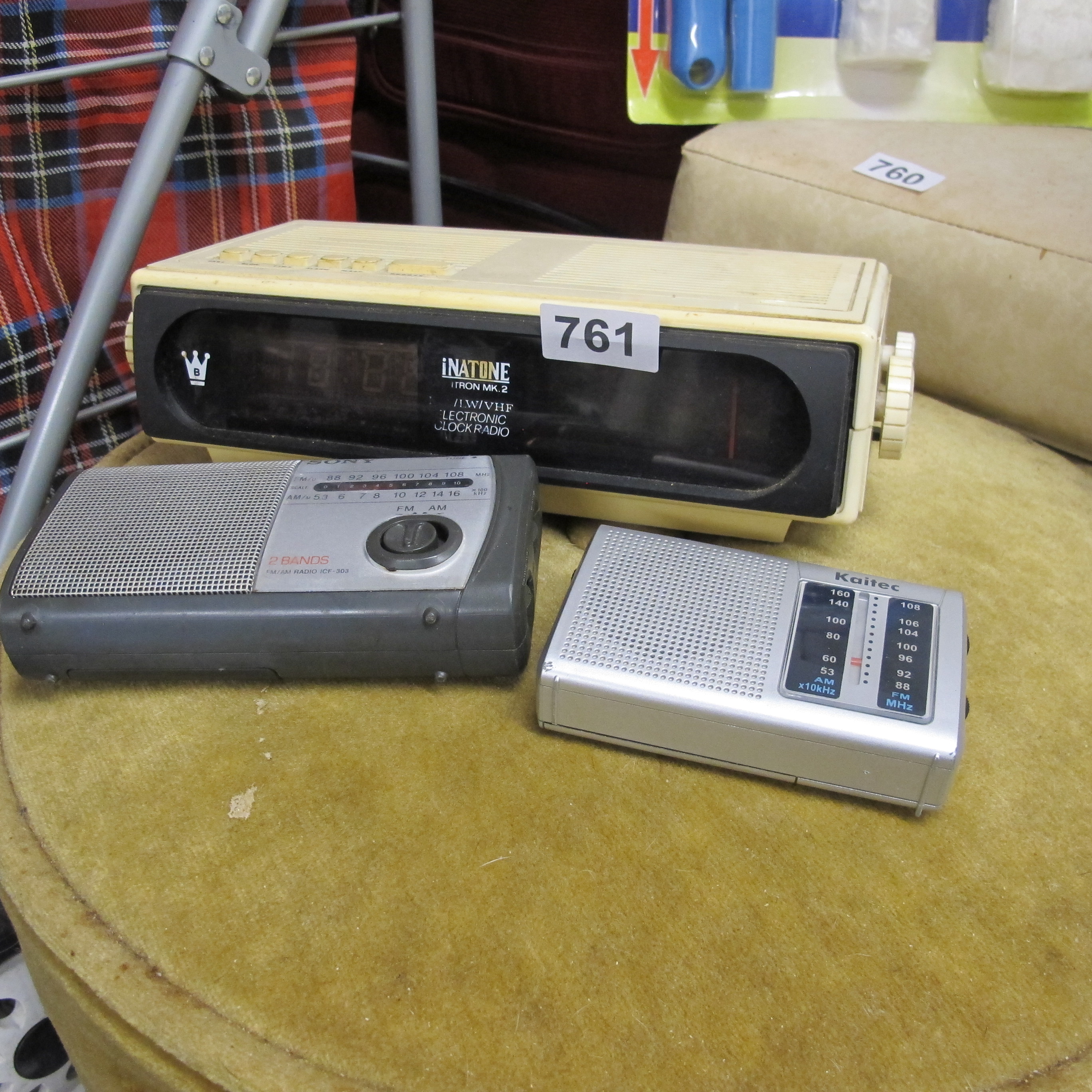 A Group of Three Vintage Electronic Radios, including an Inatone ITRON MK.2 Clock Radio, a Sony ICF-303 Portable Radio, and a Kaitec Portable Radio