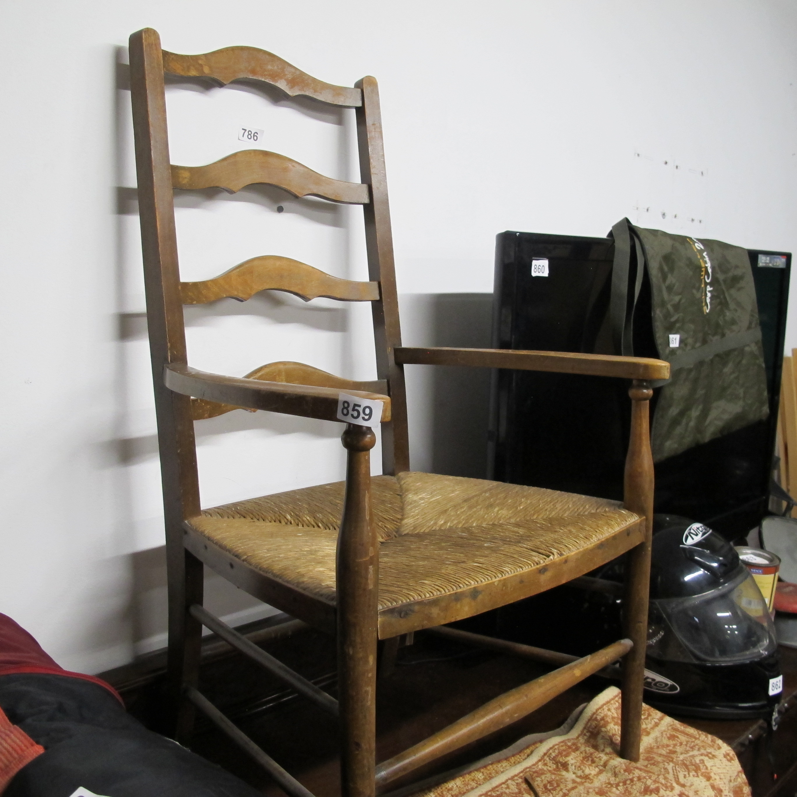 19th Century Rustic Ladderback Armchair with Rush Seat