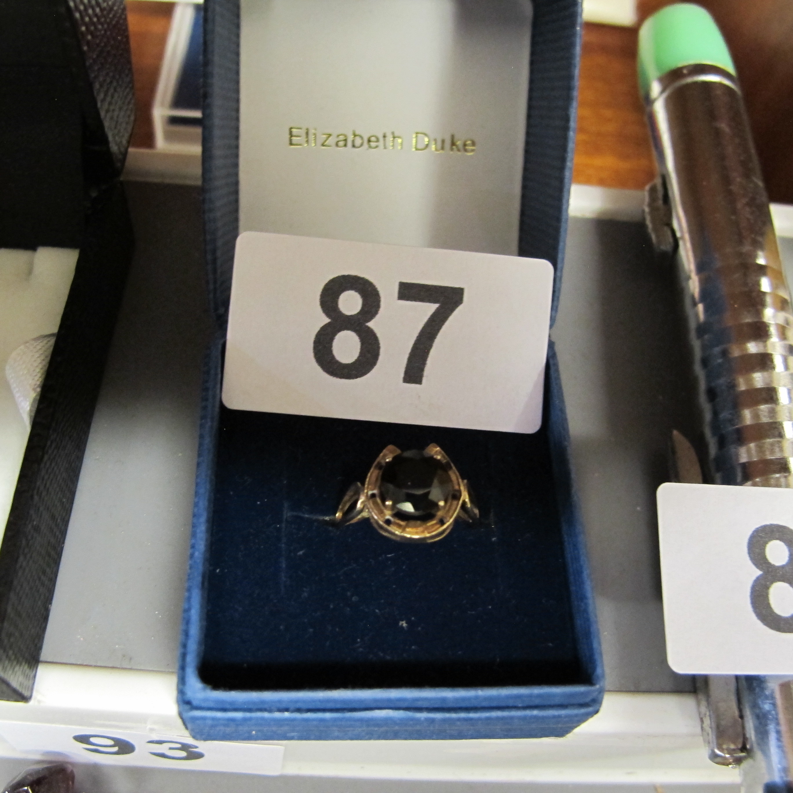 A Yellow 9K Gold and Oval Smoky aggate Quartz Ring with lucky horse shoe design. Weight 1.74g Size F