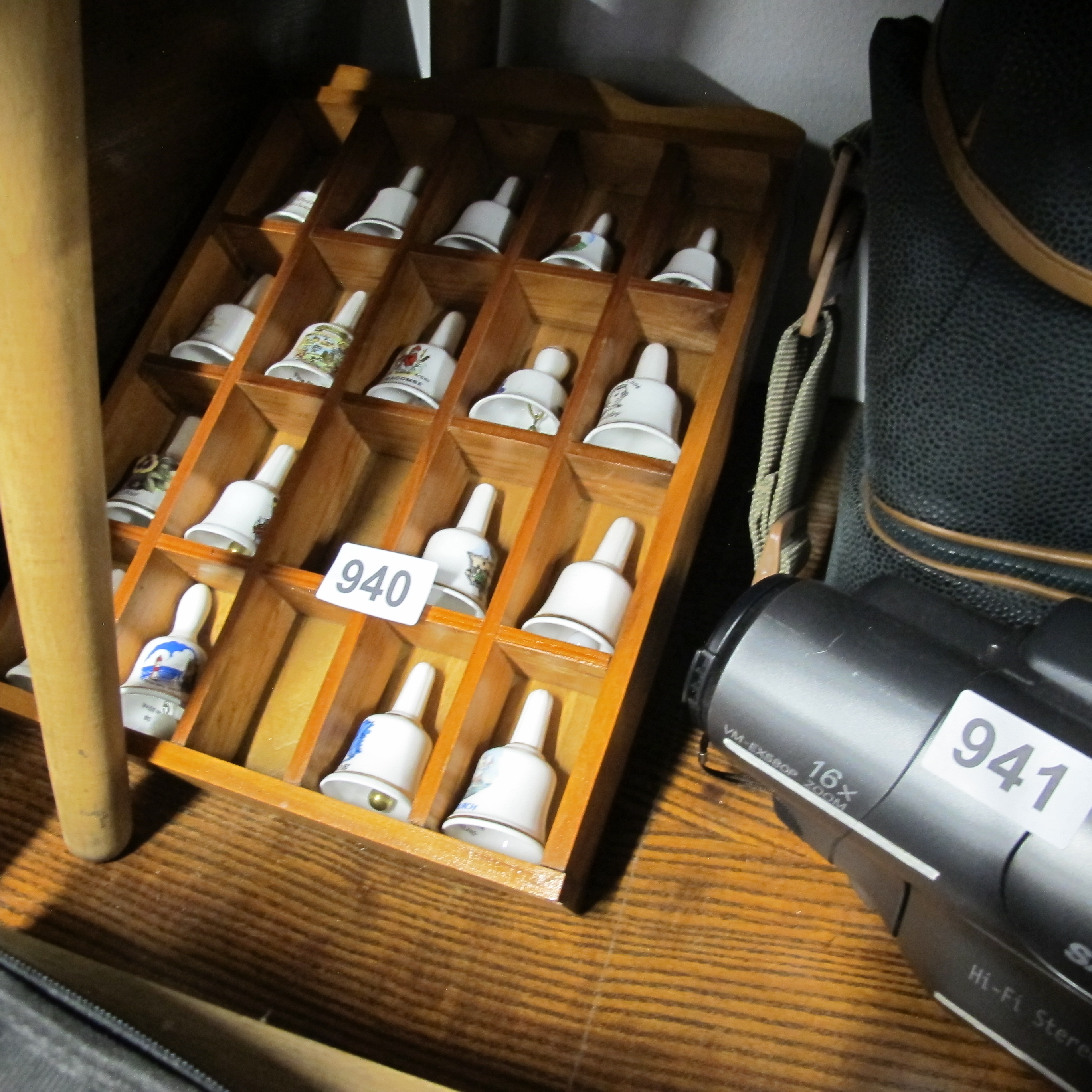 A Collection of Miniature Porcelain Bells in a Wooden Thimble Display Case