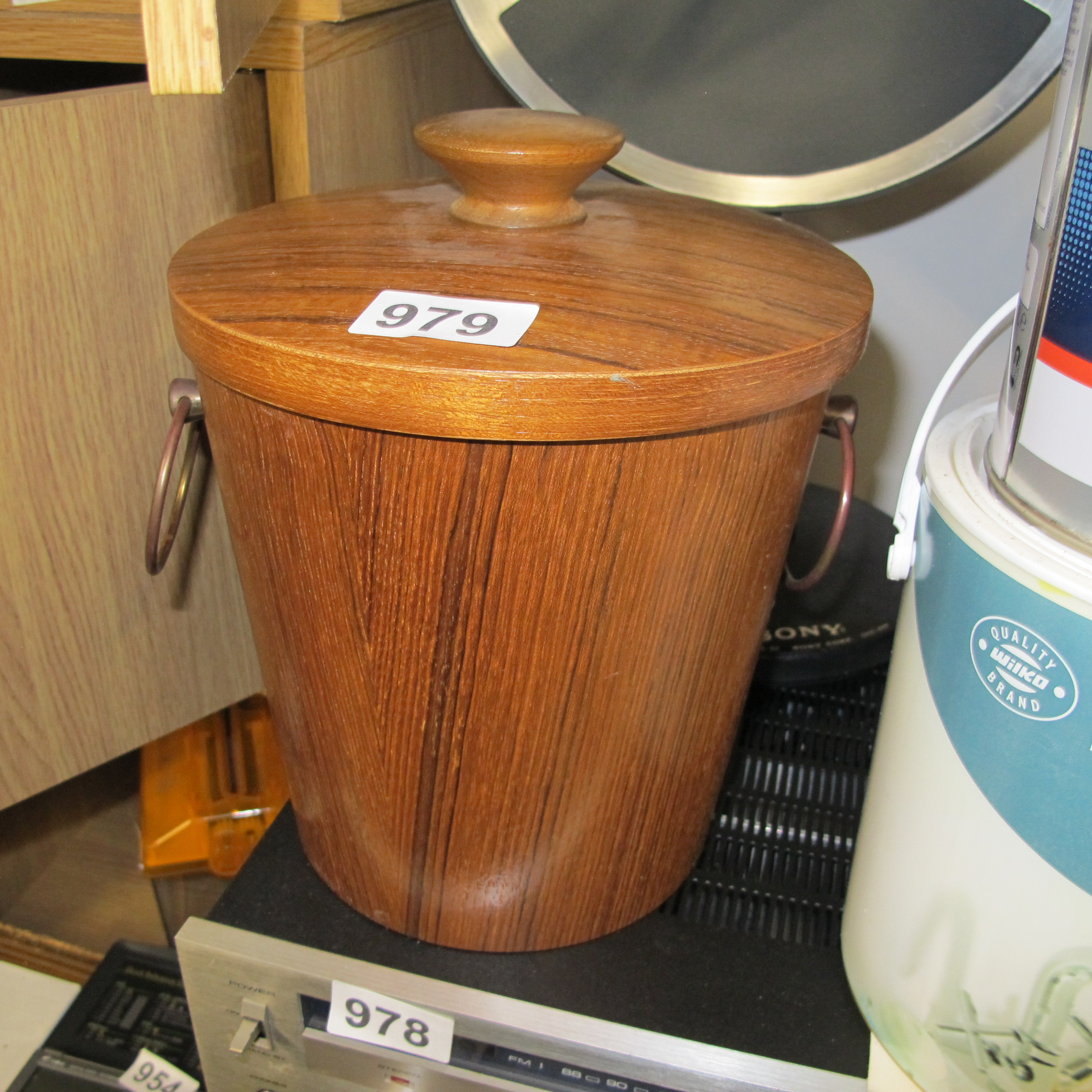 A Mid-Century Modern KMC Teak Wood Ice Bucket with Aluminum Liner and Brass Handles