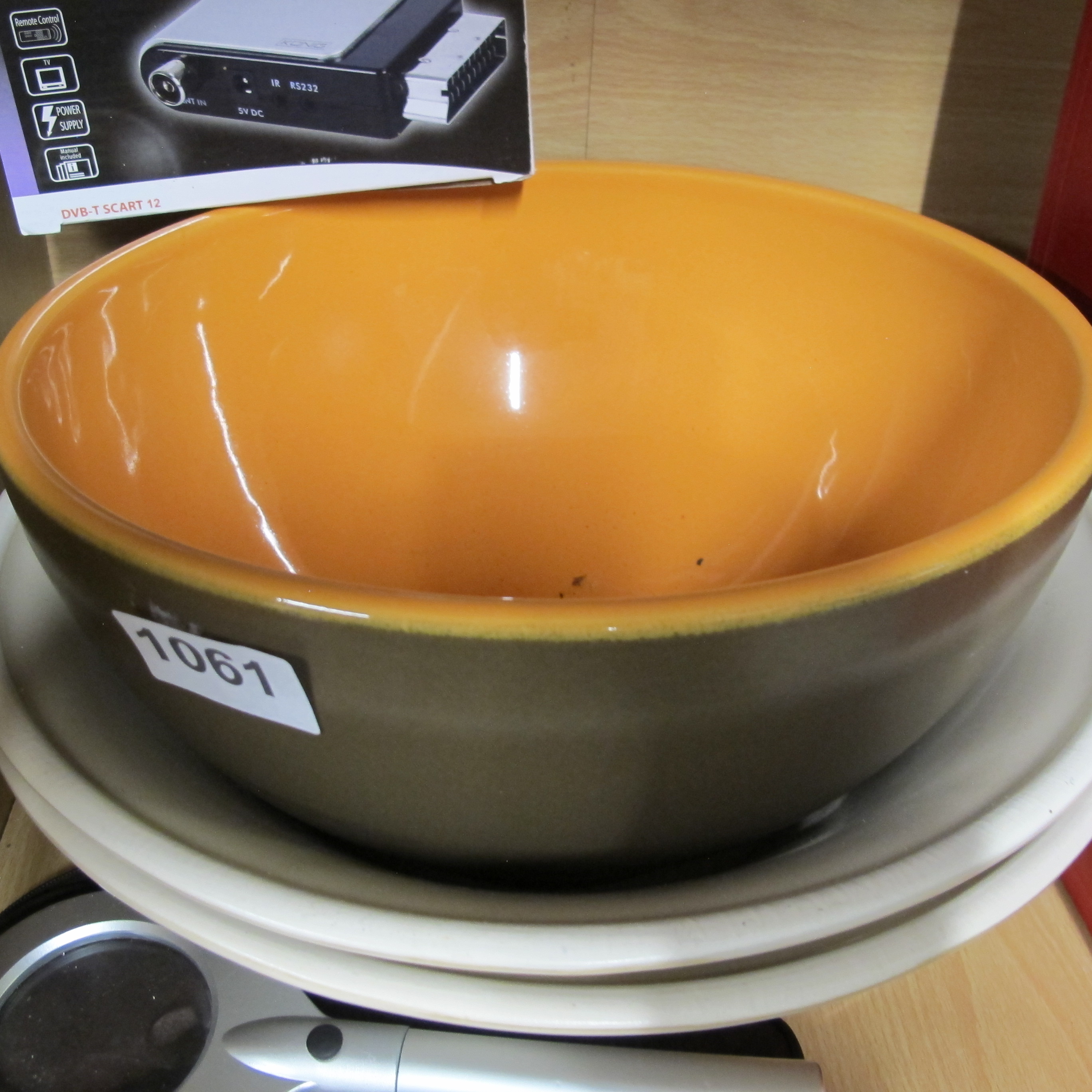 Bobby Flay Plancha Series Ceramic Serving Bowl and Plate Set, Contemporary Mid-Century Modern Style, Two-Tone Orange and Olive Glaze