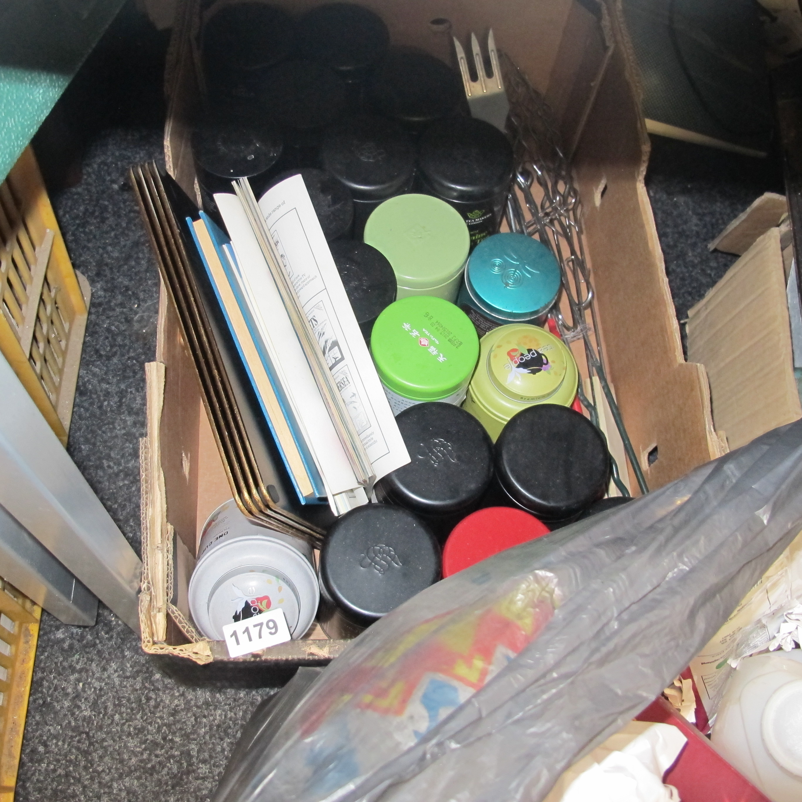 A Collection of Tea Canisters, Books, and Metal Implements