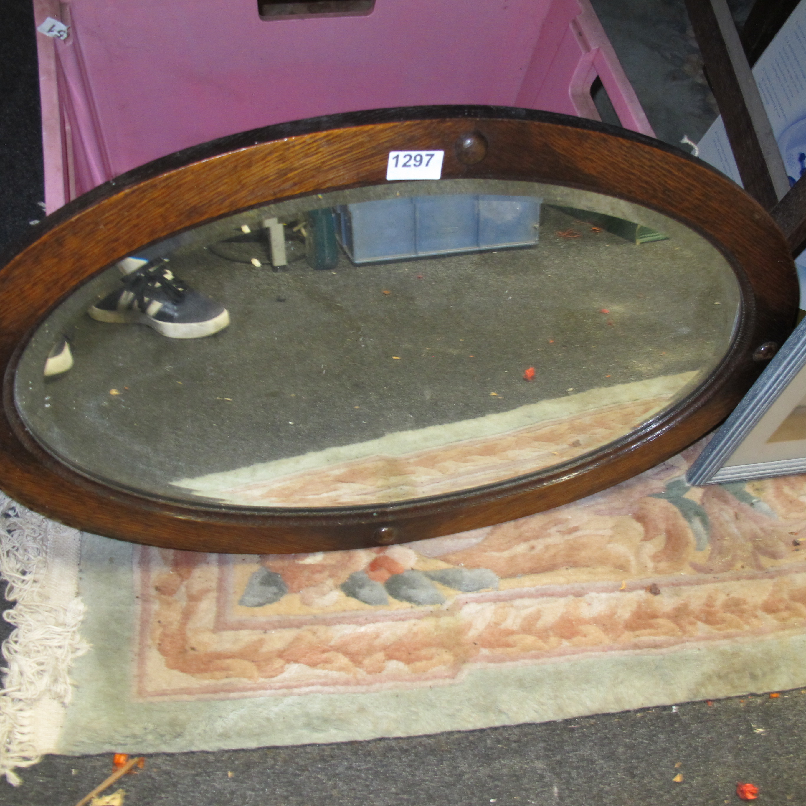 Edwardian Style Oval Oak Wall Mirror with Beveled Glass and Decorative Bosses