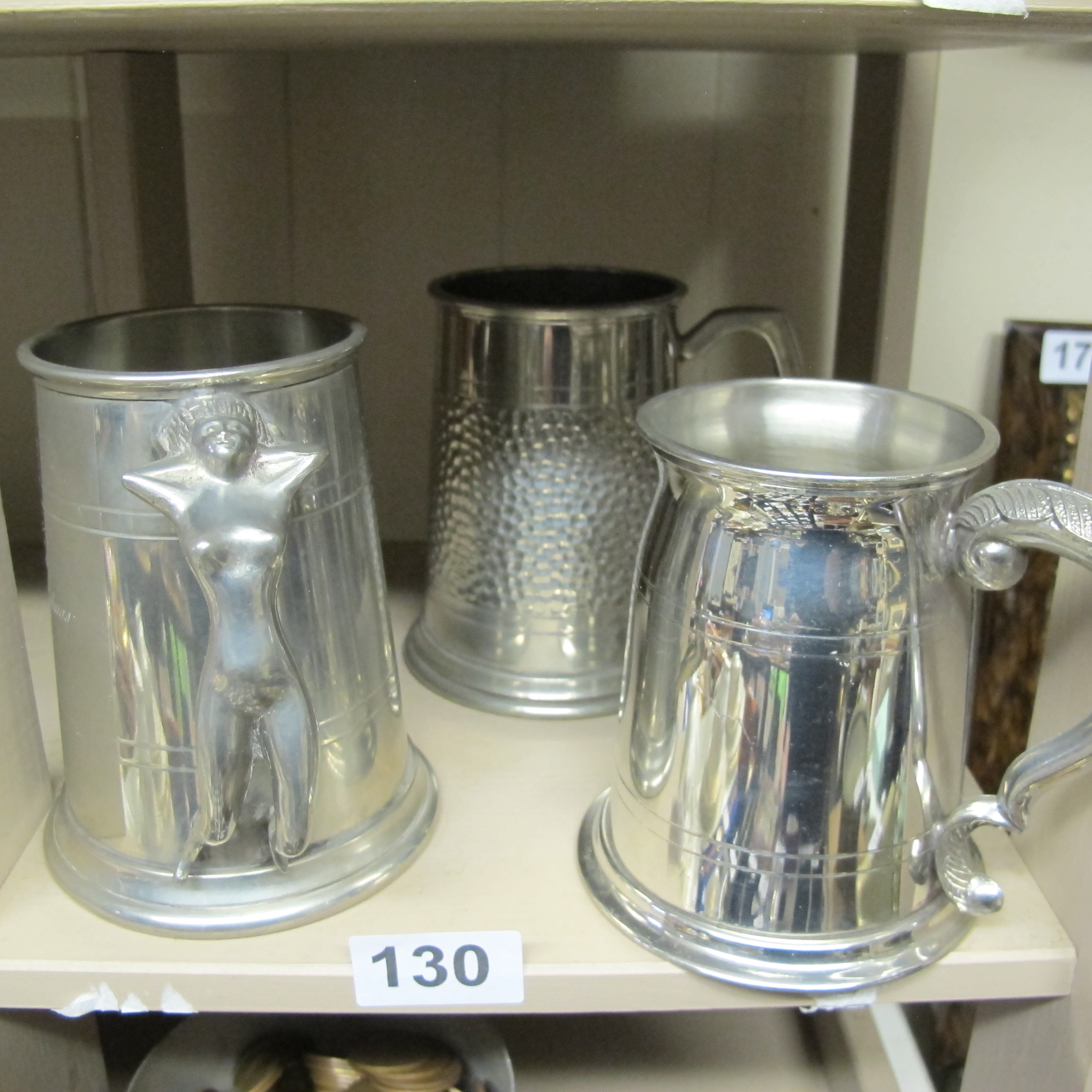 Wentworth Pewter, Collection of Three Tankards, Contemporary Traditional Style, Including Nude Relief and Hammered Designs