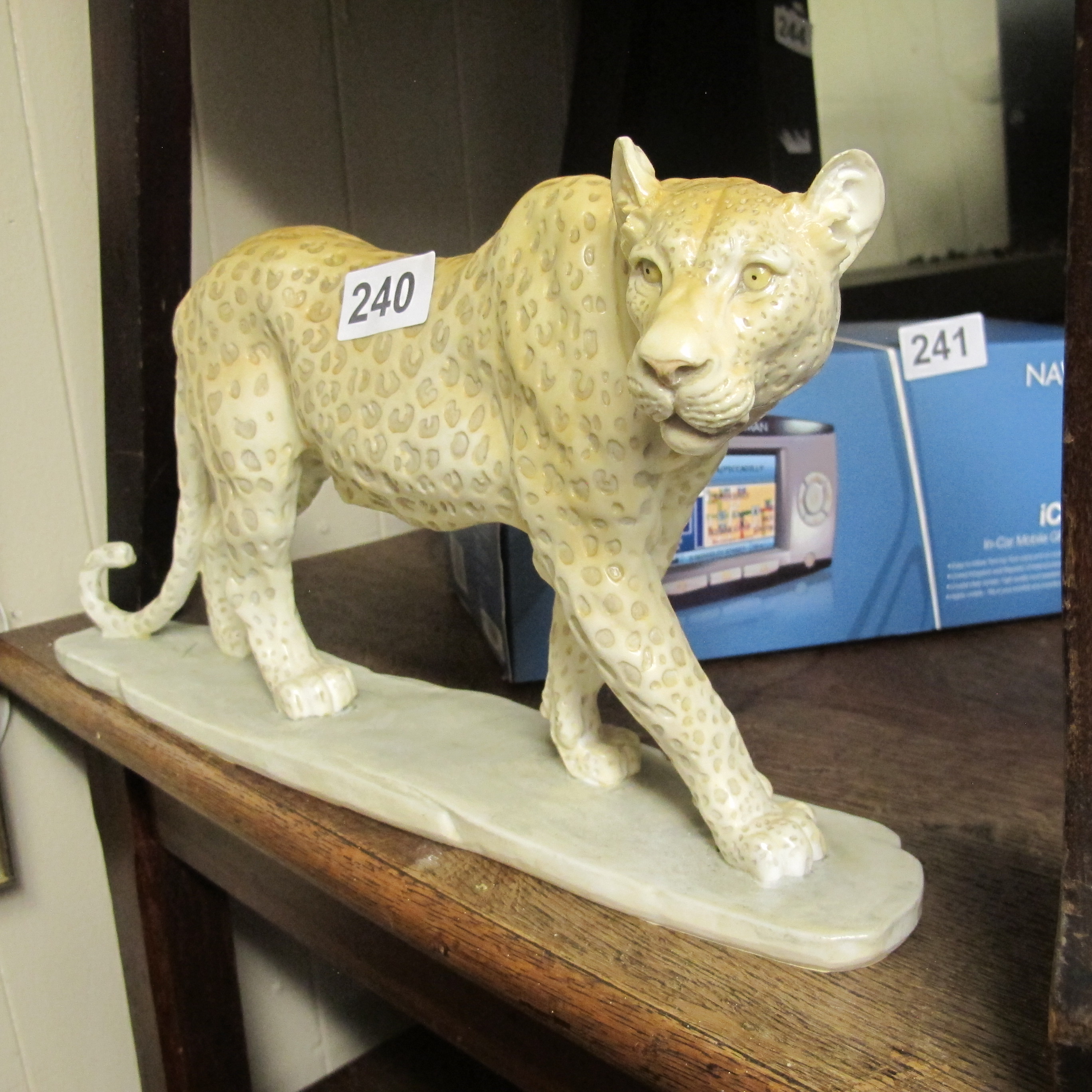 Contemporary Glazed Ceramic Prowling Leopard Figurine, Molded Rosettes