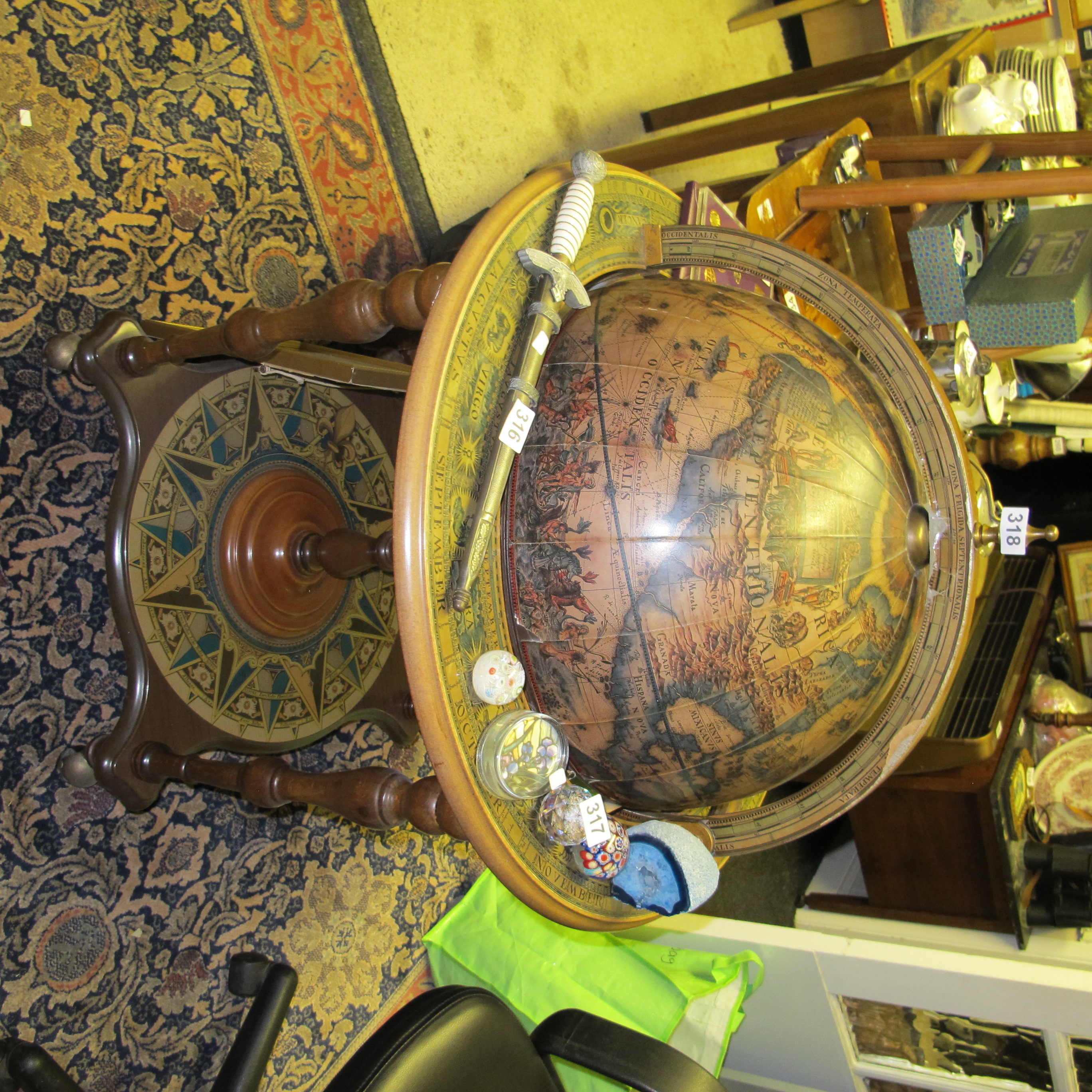 Italian Renaissance-Revival Floor-Standing Globe Bar Cabinet with WWII-Era Dagger and Millefiori Paperweights